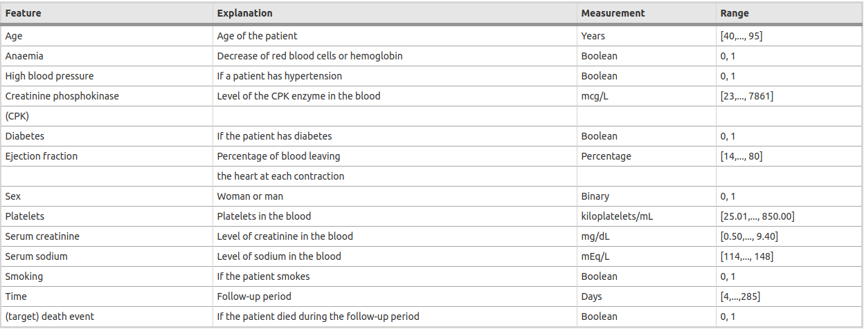 Individuals at risk of CVD may demonstrate raised blood pressure, glucose, and lipids as well as overweight and obesity. These can all be easily measured in primary care facilities. Identifying those at highest risk of CVDs and ensuring they receive appropriate treatment can prevent premature deaths. Access to essential noncommunicable disease medicines and basic health technologies in all primary health care facilities is essential to ensure that those in need receive treatment and counselling.The dataset contains medical records of 299 patients who had heart failure, collected during their follow-up period, where each patient profile has 13 clinical features. https://archive.ics.uci.edu/ml/datasets/Heart+failure+clinical+records