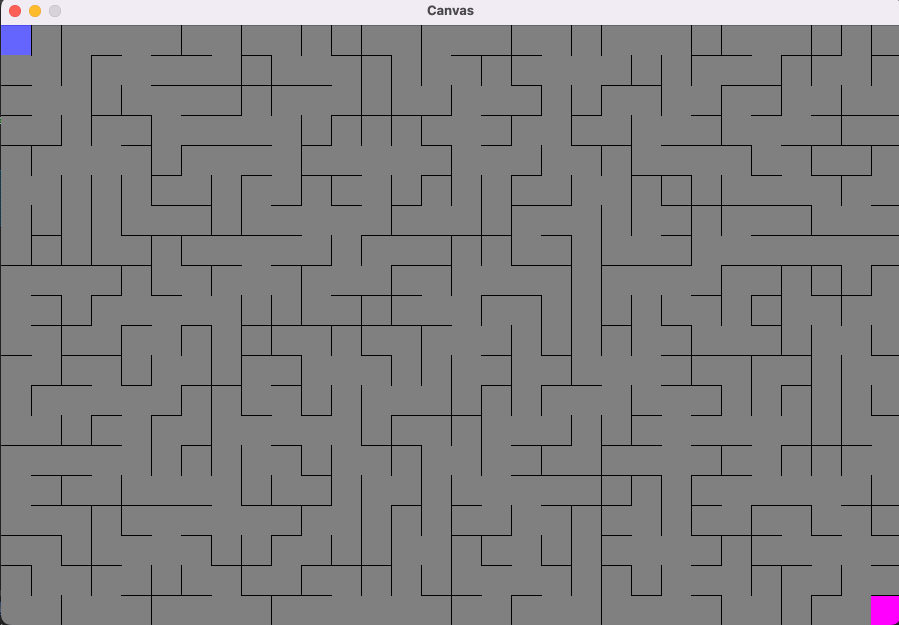 This project was the final homework assignment for my Fundamentals of Computer Science II class at Northeastern University. The goal was to practice working with graphs and graph algorithms by designing mazes using Kruskal’s algorithm to generate minimum spanning trees, and solve them using either breadth- or depth-first searches. We were also tasked with animating the search algorithms.