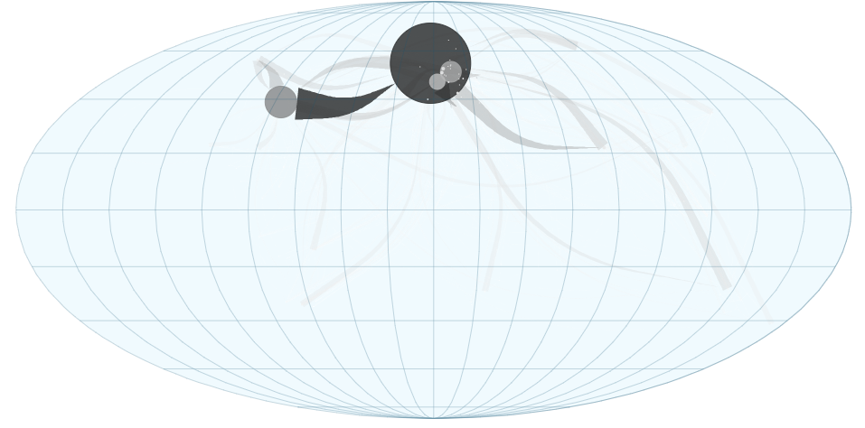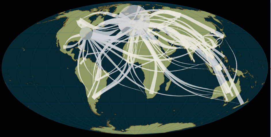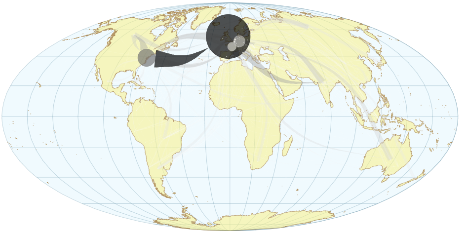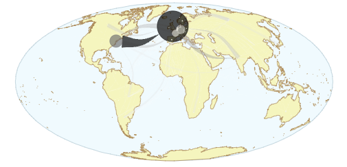 Commentaire : la sélection des flux commerciaux qui parcourent de l'ordre de 4000 à 12000 kilomètres de distance correspond aux flux commerciaux à moyenne distance, qui s'expriment principalement dans l'hémisphère nord.. Ces flux de moyenne distance représentent 34% du volume total de marchandises qui correspond à 25% des relations financières commerciales les plus importantes, qui s'expriment entre 4% des pays les plus riches. On notera que seules l'Amérique du nord et des pays de l'Europe de l'ouest sont impliqués dans ces échanges - dont on rappelle qu'ils correspondent au cumul des valeurs observées sur l'ensemble de la période.