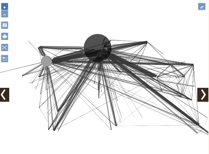La partie centrale correspond à la vue cartographique. Elle résulte du choix des couches à afficher (réalisé sur la partie gauche) et du filtrage des valeurs des liens et des noeuds (réalisé sur la partie droite).