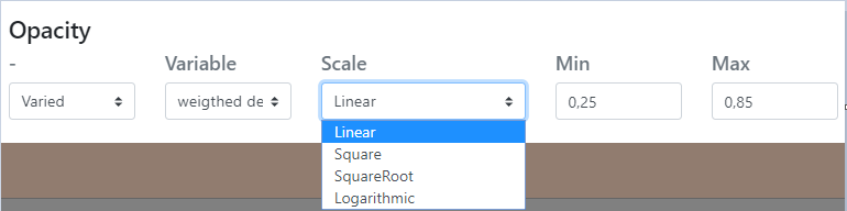 Opacité / Variable : L'opacité de la teinte des noeuds est variable, en fonction d'un caractère (ici le degré pondéré, weighted degree), selon une fonction (linéaire, carrée, racine carrée et logarithmique) paramétrable, dont il est possible de définir les valeurs minimum et maximum, respectivement 0.25 et 0,85, par défaut.