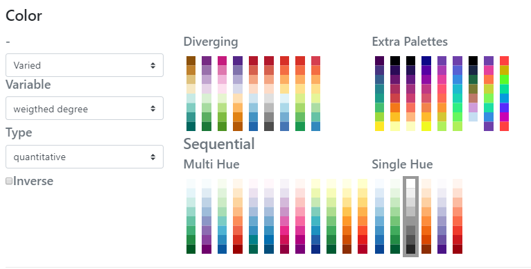 Couleur / Variable : La teinte des noeuds ne sera pas identique pour tous, mais basée sur un dégradé de ton prédéfini. Le choix de la progression (divergente ou non) sera fonction du type de caractère (précisé dans le champs type).