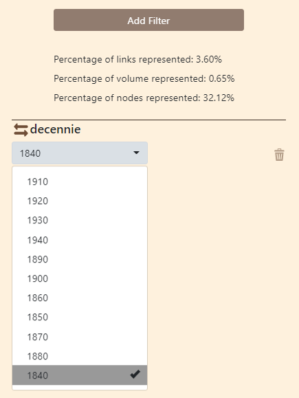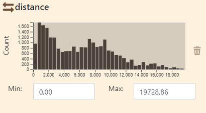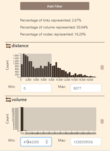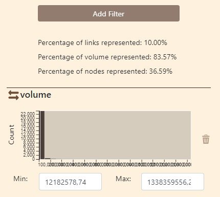 La part d’information sélectionnée, les valeurs minimales et maximales sont indiquées automatiquement sur la figure. Pour les liens, la possibilité d’un filtrage selon la distance géodésique parcourue est en outre proposée.