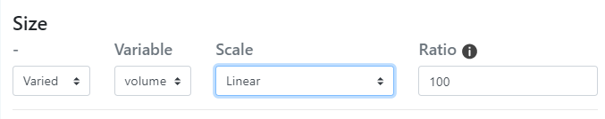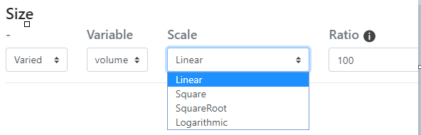 Taille / Variable La taille (surface) des noeuds est variable, selon une fonction (racine, racine carrée ou logarithmique) proportionelle à la valeur d'un caractère (quantitatif discret - de stock).