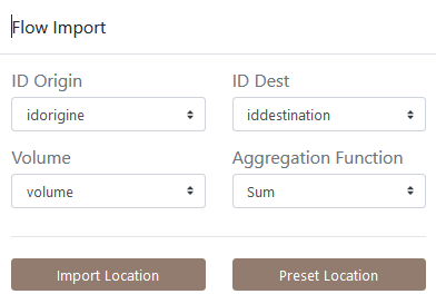 Si vous avez des données de localisation associées à vos OD, vous pouvez charger les fichiers de nœuds correspondants par "import Location", sinon vous pouvez utiliser des localisations pré-définies avec "Preset Location".