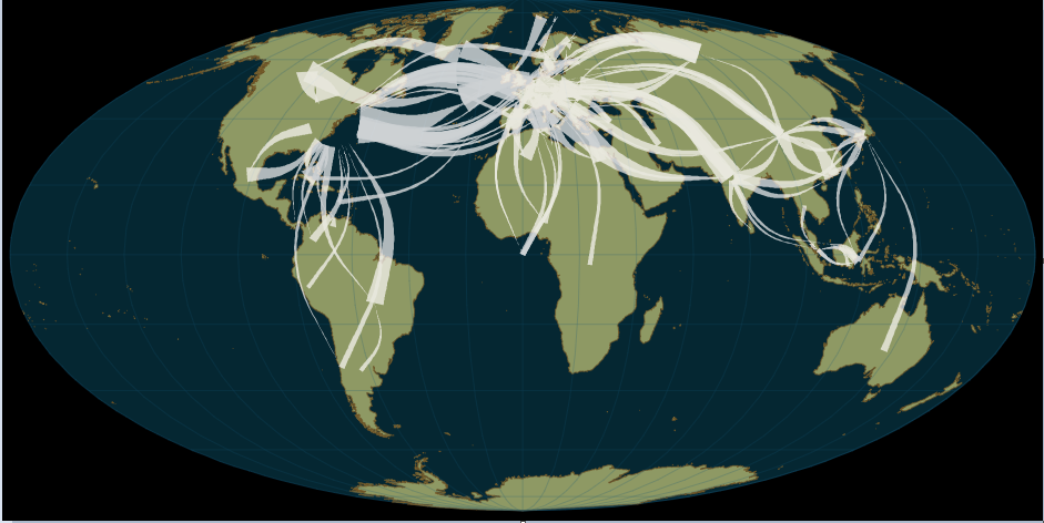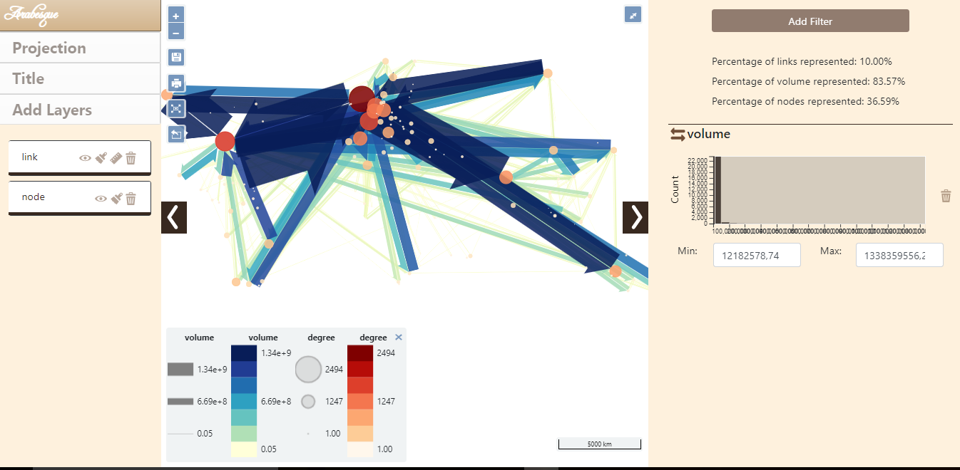 arabesque vous permet également d'importer vos propres ensembles de données de flux, sous la forme d'une matrice origine-destination (format liste d'adjacence en CSV), de les explorer, de les filtrer pour créer une carte de flux lisible, en accord avec les principes de la sémiologie cartographique.