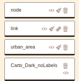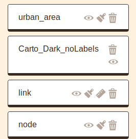 L'apparence des couches de liens (forme, couleur, opacité, taille) peut être modifiée à deux moments : soit lors de l'import, ou de la création de la couche - ce qui entraînera alors la suppression de la couche actuelle - (voir section 5.2), soit lors de la gestion des couches affichées, en agissant sur les icônes :