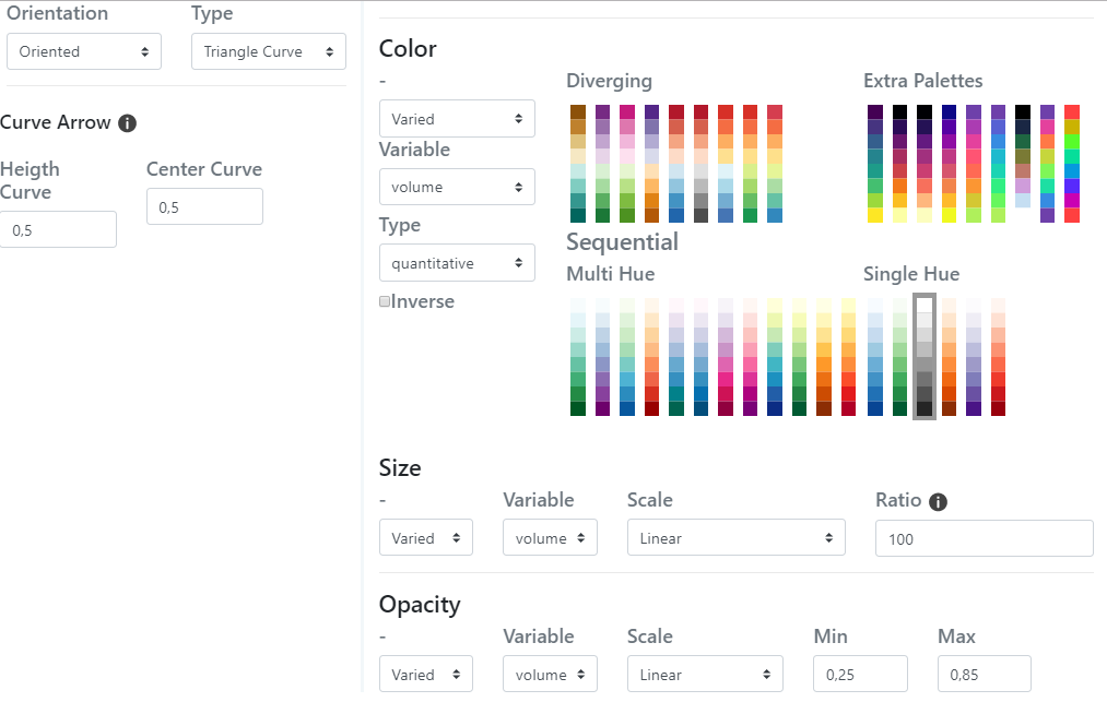 Arrow / Hauteur (Height curve): La valeur de la hauteur de la tête est le pourcentage de la distance cartographique du lien (distance entre l'origine et la destination) utilisé pour définir la largeur (cartographique) maximale du lien - la largeur étant elle même fonction de la valeur du flux.