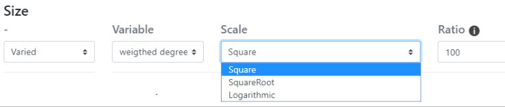 Idéalement, il est nécessaire de paramétrer simultanément la taille des noeuds, en utilisant le même caractère (ici le nombre de degrés pondéré - weighted degree) - sinon, les noeuds conserveront la même taille et le résultat de l'application d'une nuance sera peu visible.
