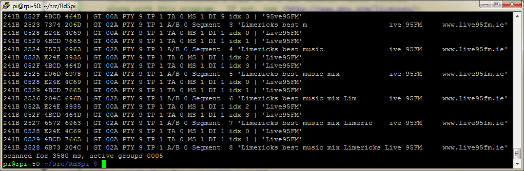 rdspi tune 9500to tune to 95.00 MHz - rds on|off|verbose - sets RDS mode, on/off for RDSPRF, verbose for RDSM