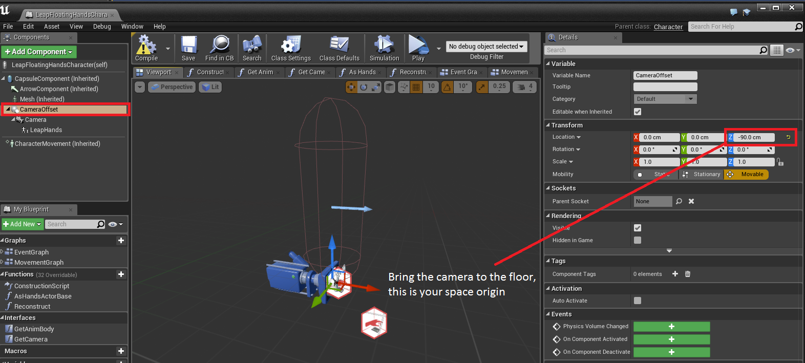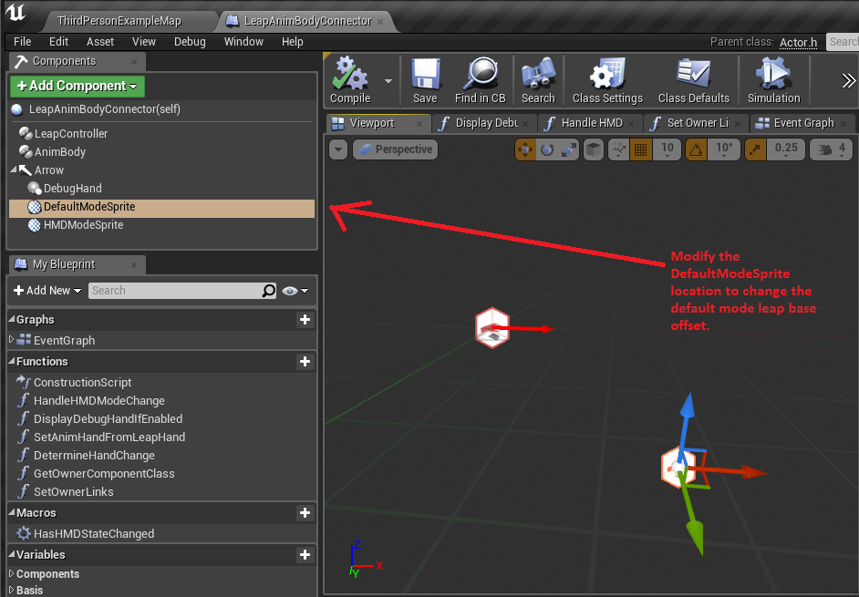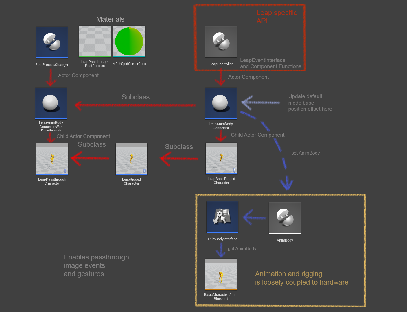What this setup gives you in flexibility is that you have many entry points from which to modify any aspect of the rigging. E.g. If you wish to change post process material being used you would change it in the PPChanger blueprint while still retaining every other functionality. Or if you want to adjust the default mode offset (where your leap is in relation to you when place on the table) you would modify the LeapAnimBodyConnector component which specifies its location. If you want to use your own skeletal mesh, simply replace the mesh, but retain the animation blueprint (use animation retargeting if you're using different skeletons). In fact the rigging setup doesn't even need the leap motion to work, any input which would change the AnimBody skeleton to whatever pose you wish to attain would have the same rigged behavior. The setup is the beginning part of a BodyInput plugin which will support a similar setup for various VR inputs in the future.