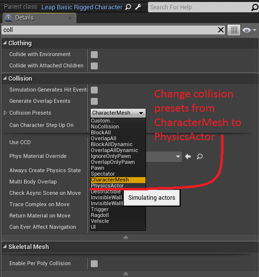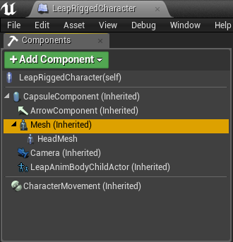 Convenience content relation diagramThe LeapBasicRiggedCharacter has only one skeletal mesh and can be used as a basis for basic non-VR characters. If you're rigging a VR character you should split the mesh head from the body so that it can be hidden from the character in order to alleviate clipping issues, this is the functionality that the LeapRiggedCharacter extends from the basic version. Finally if you want to have automatic access to passthrough mode, use the LeapPassthroughCharacter.