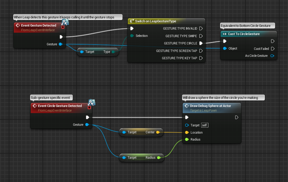 With 0.7.2 the plugin supports the gesture sub-classes directly, here is an example of showing a debug sphere around the circle you are gesturing. Note that you can use the generic gesture detection event and cast the gesture to your sub-gesture or use the sub-gesture specific event. Both are equivalent.leap-ue4