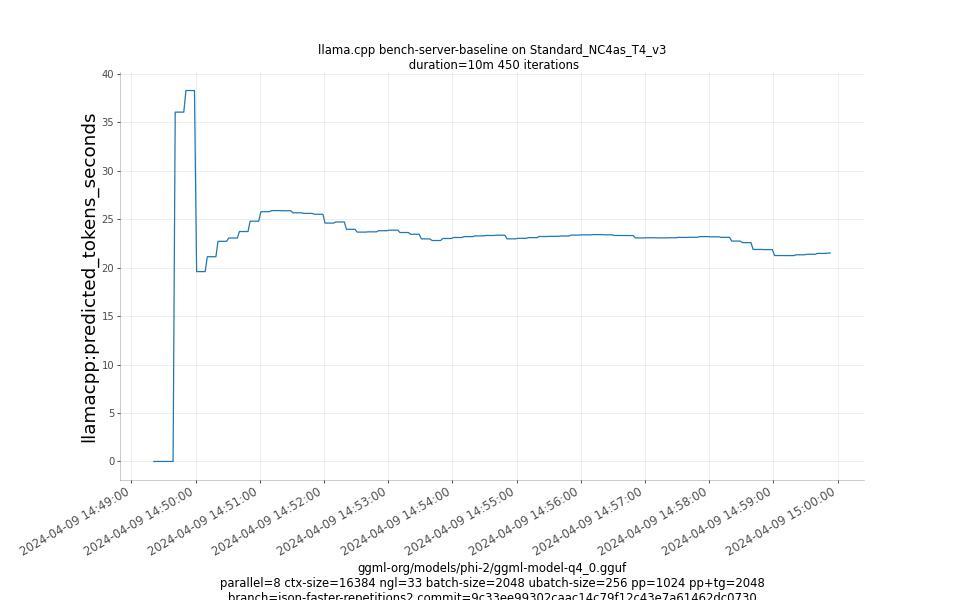 @HanClinto It can quickly become an unfair fight depending on the schema and the model's generation choices (in some cases the speed may appear the same, but the worst case is now bounded). If you expand the "Show command" drawer in the PR's description, the simple example I gave goes from being essentially stuck until the end of the universe to something Here's how to benchmark any schema you'd like (using hyperfine): git clone https://github.com/ochafik/llama.cpp --branch json-faster-repetitions2 llama.cpp-faster-rep