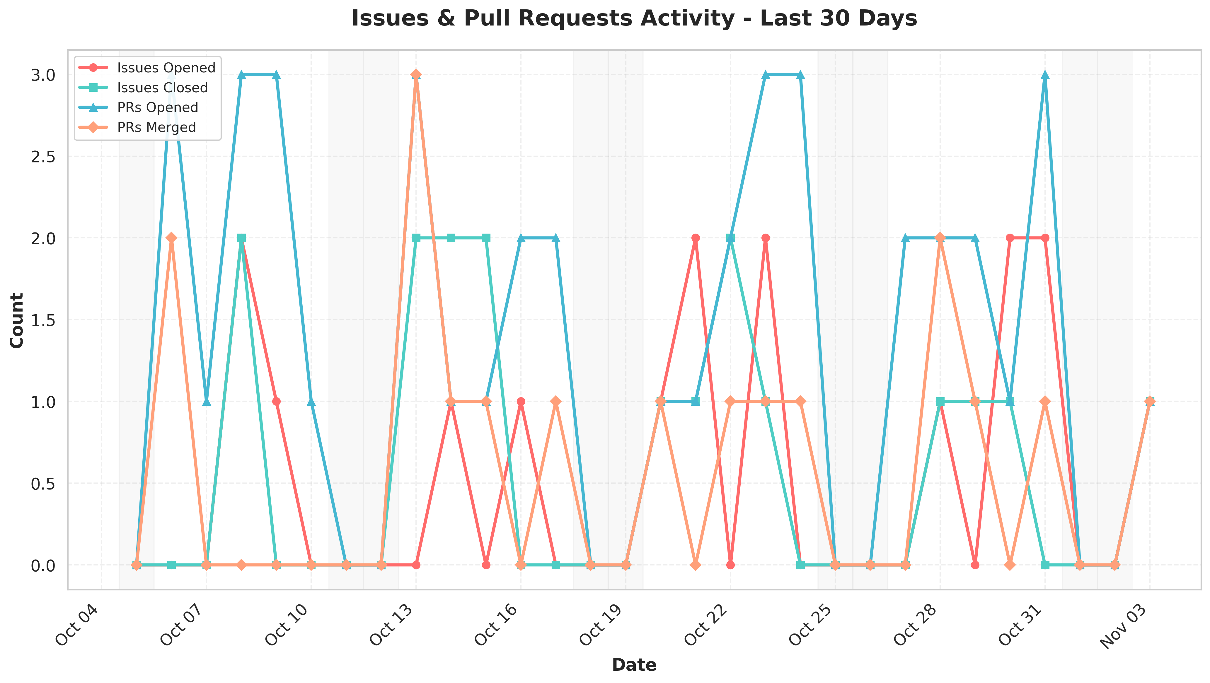 The last 30 days show steady development activity with consistent issue and PR management. We're maintaining a healthy balance between opening and closing issues, which indicates good issue hygiene. PR activity shows regular contributions with successful merge patterns throughout weekdays, demonstrating a well-functioning collaboration workflow.