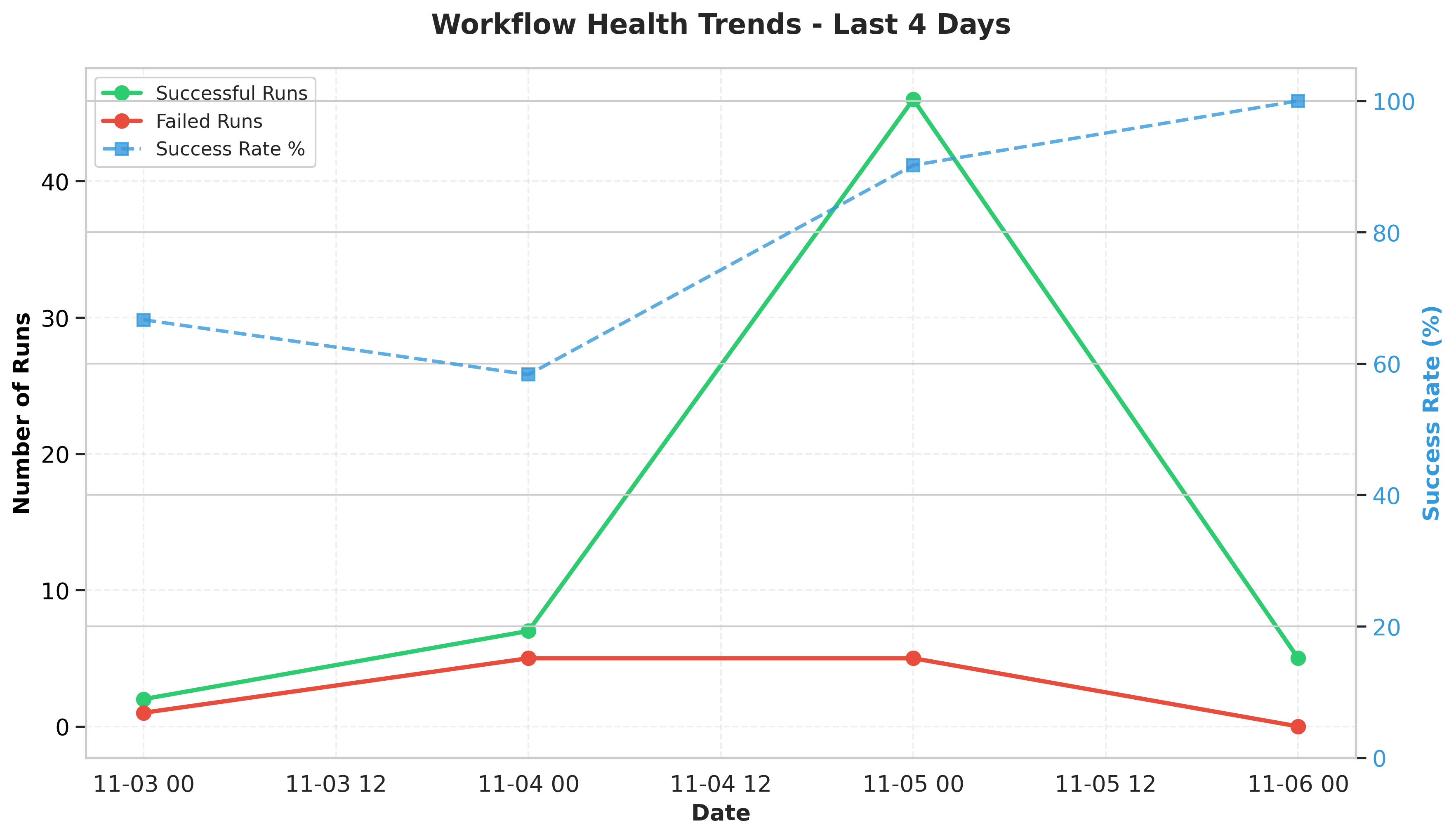 The trend chart shows workflow execution patterns over the last 4 days (Nov 3-6). The success rate has remained relatively stable in the 80-90% range, with November 5th showing the highest activity (27 runs total) and the best success rate. The failed runs are distributed across different days, indicating no systematic degradation in workflow reliability.