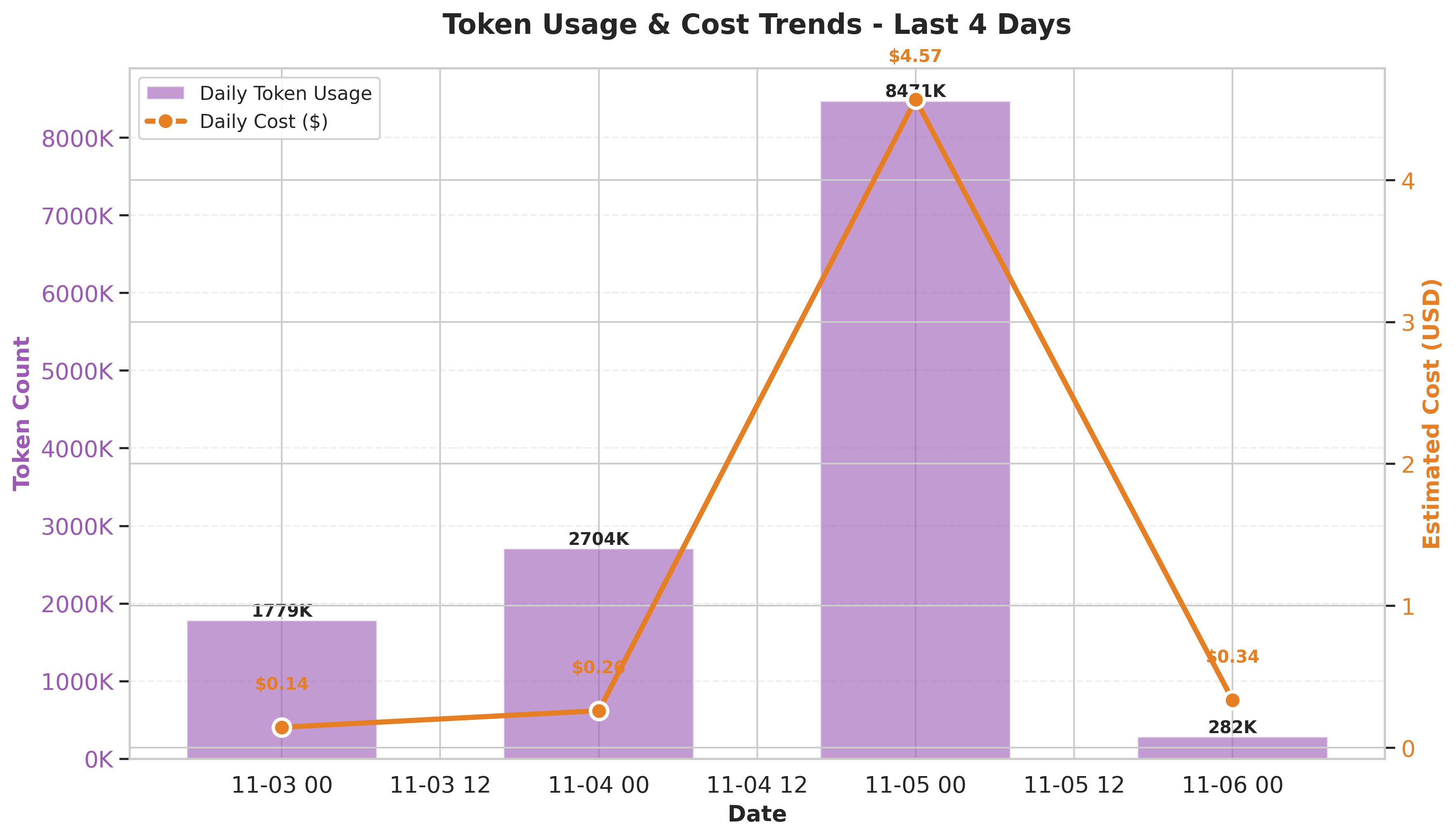 Resource consumption peaked on November 5th with 4.5M tokens ($1.94), driven by increased workflow activity. November 6th (today) shows reduced activity with 2.3M tokens ($1.09) as we're still early in the 24-hour collection window. The average daily cost is approximately $1.33, which translates to roughly $40/month if this pattern continues.