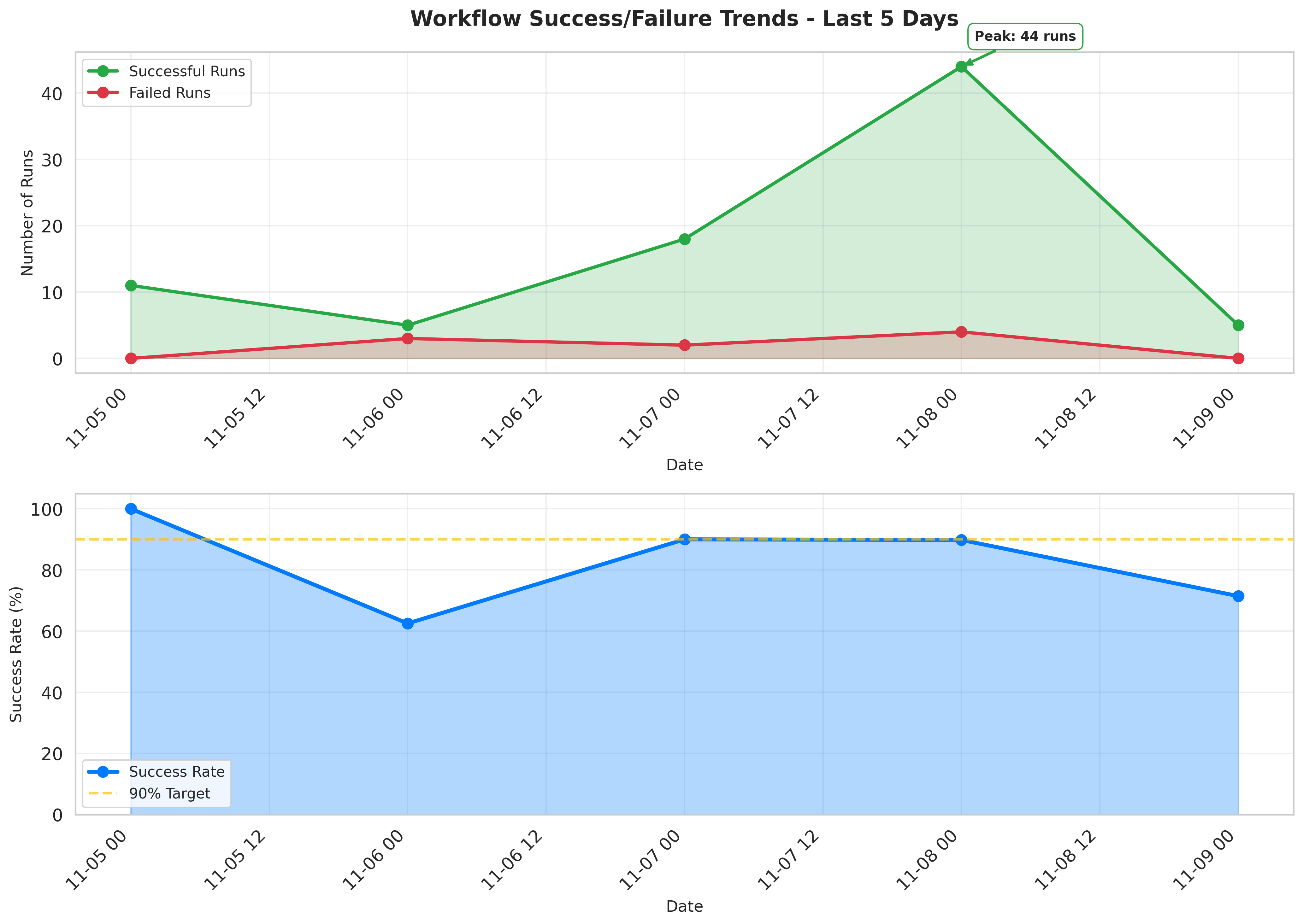 The trend chart shows workflow health over the last 5 days. Notable observations: