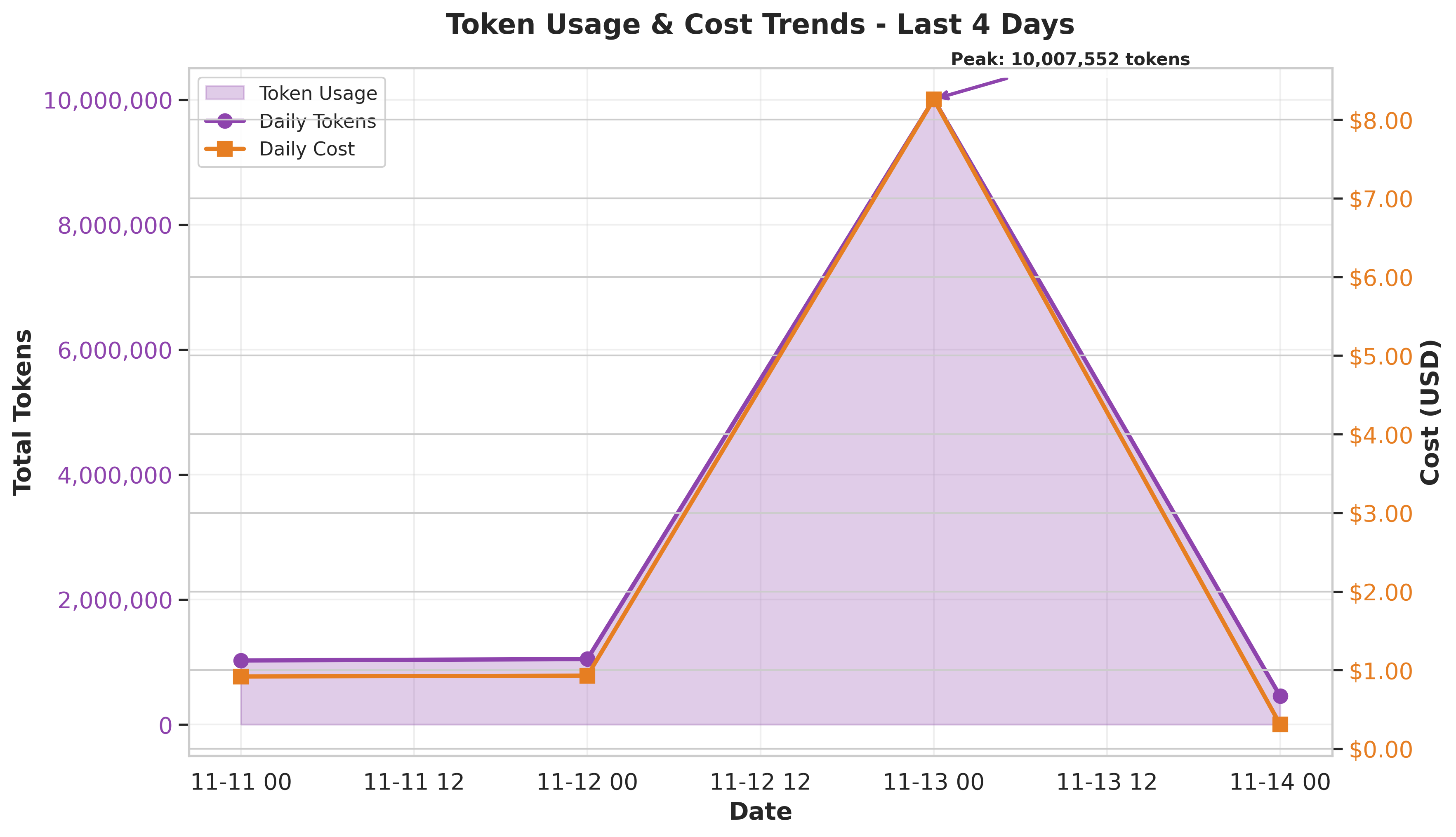 Token consumption exhibits a clear peak pattern on November 13 with 9.6M tokens used, costing $8.60. This represents an 18x increase from November 11's baseline. The spike correlates with 60 workflow runs on that day, suggesting high-volume activity rather than individual workflow inefficiency. Daily costs range from $0.22 to $8.60, with an average of approximately $2.60 per day across the period.