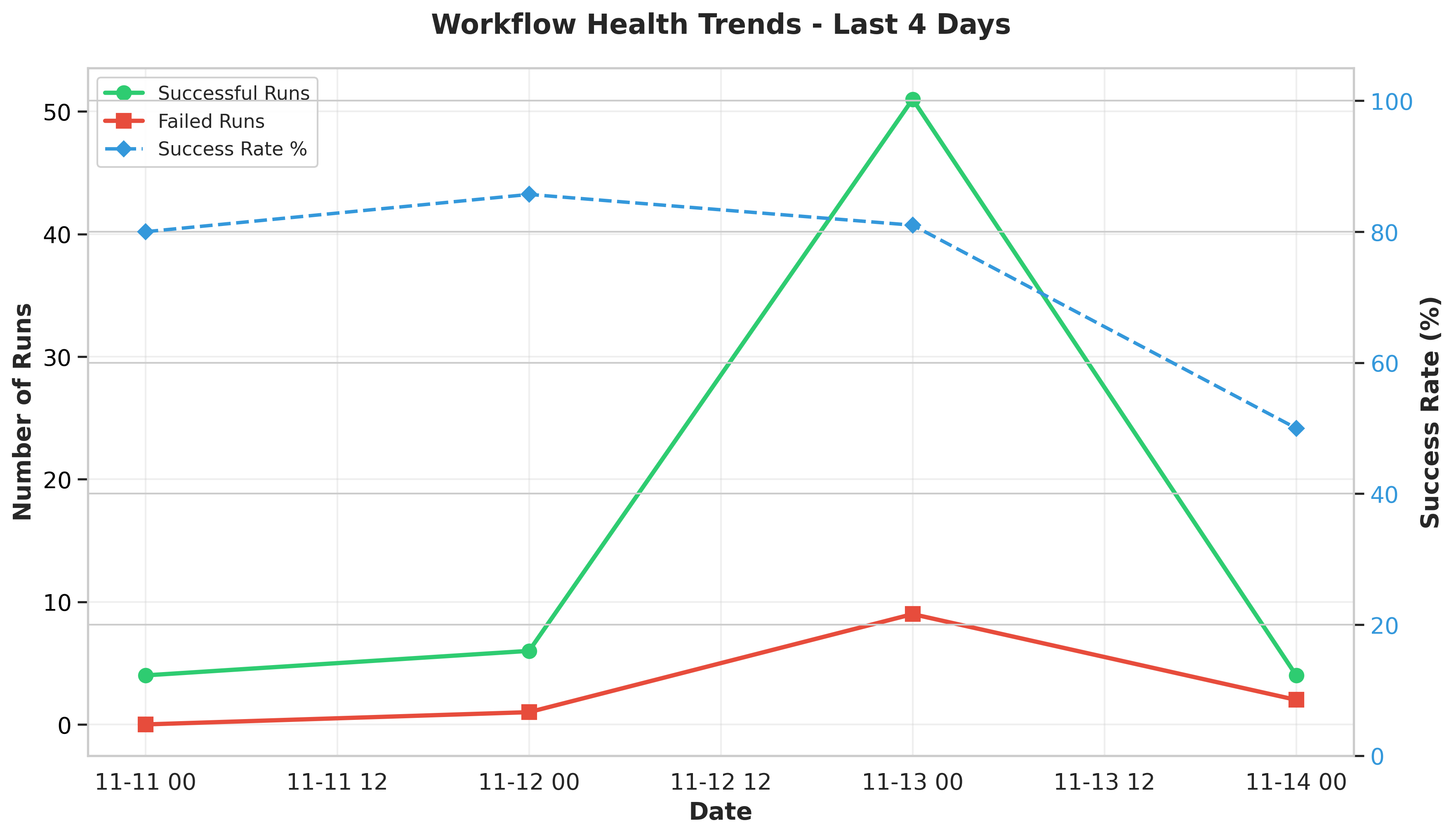 The chart reveals concerning volatility in workflow health. November 11-13 maintained strong performance with success rates of 80-85%, but November 14 shows a sharp decline to 50% success rate. This represents a 35-percentage-point drop that requires immediate investigation. The increase in failed runs on November 14 (2 failures vs. 0-1 in previous days) suggests either environmental changes or newly introduced issues.