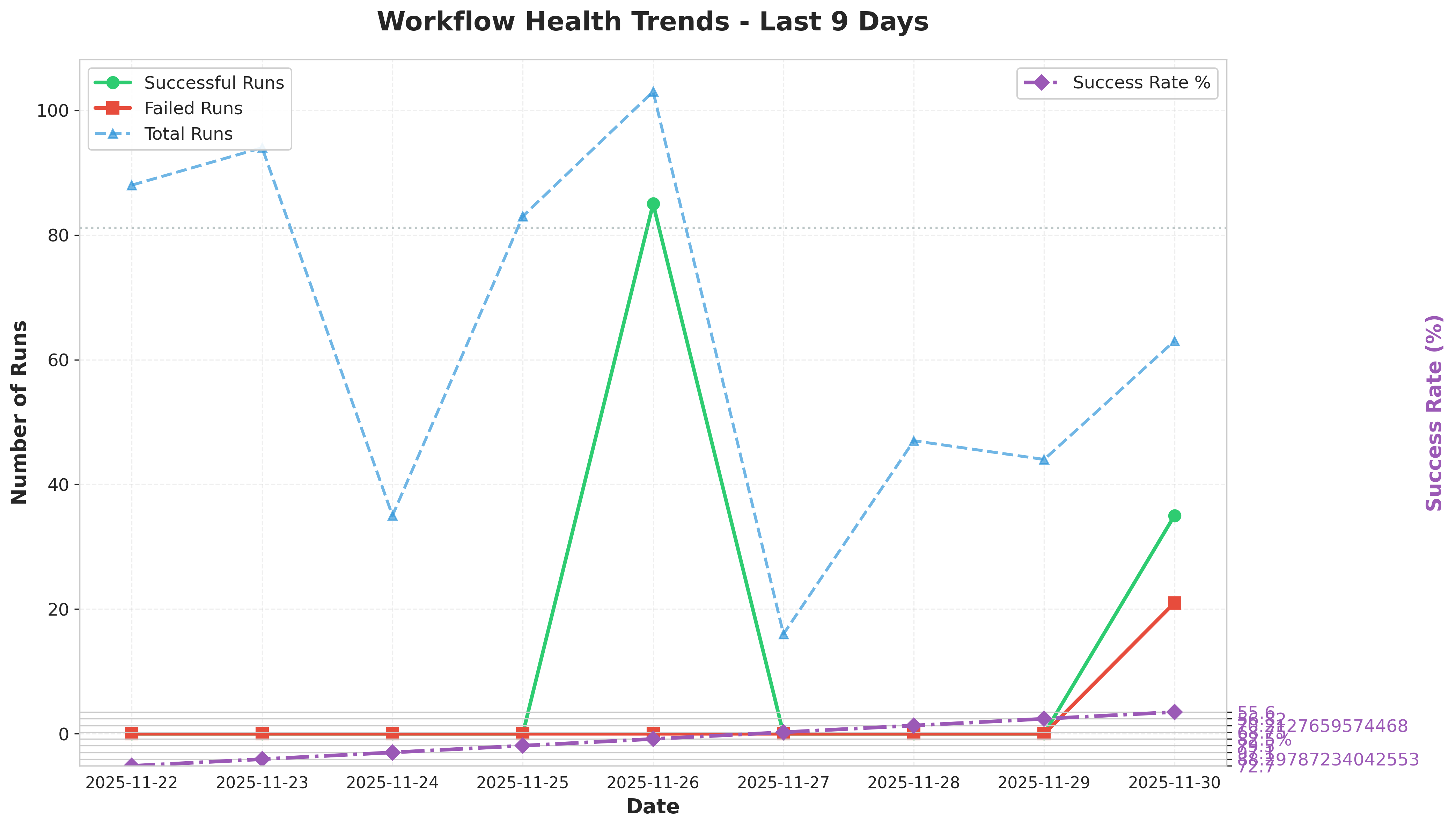 The chart shows a clear downward trend in success rates over the past 9 days. The success rate has dropped from 82.5% (Nov 26) to 55.6% (today), falling well below the 80% target threshold. This decline correlates with increased workflow activity but suggests systemic issues affecting multiple workflows.