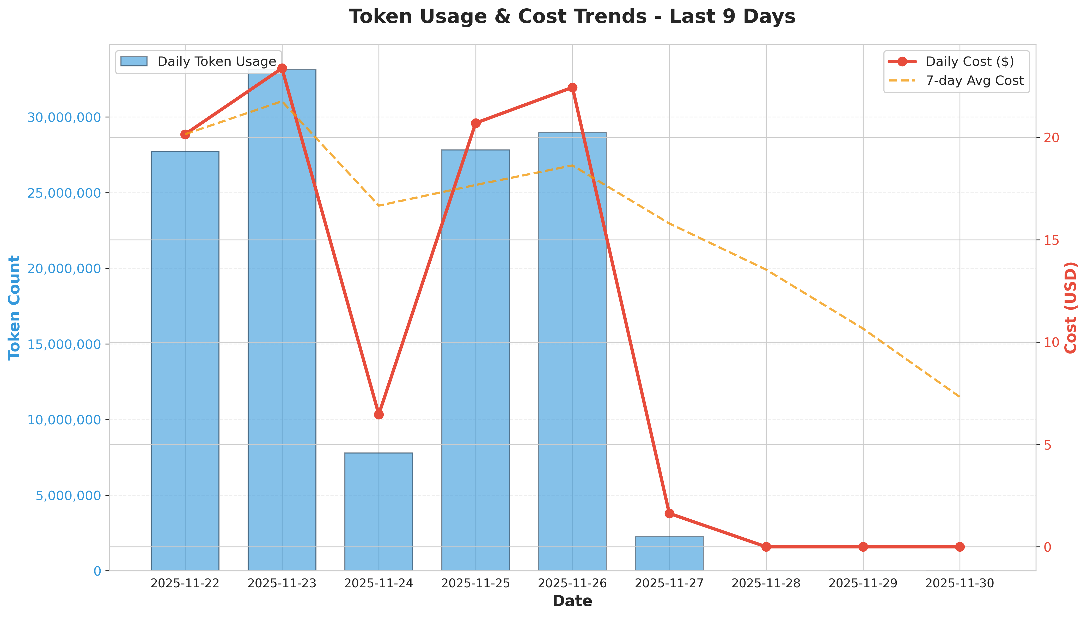 A significant concern: no token usage or cost data has been recorded for the last 3 days (Nov 28-30). This represents a complete loss of resource tracking despite active workflow runs. Previous days showed costs of $20-22 daily, making this data gap critical for budget monitoring.