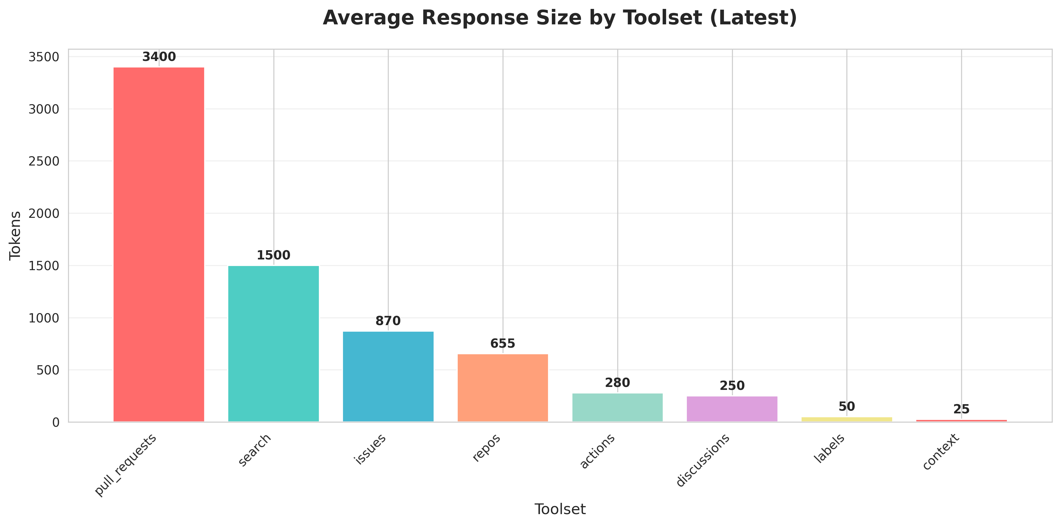 This chart shows the average token count for each toolset. Labels and branches are highly efficient, while pull requests consume significant context.