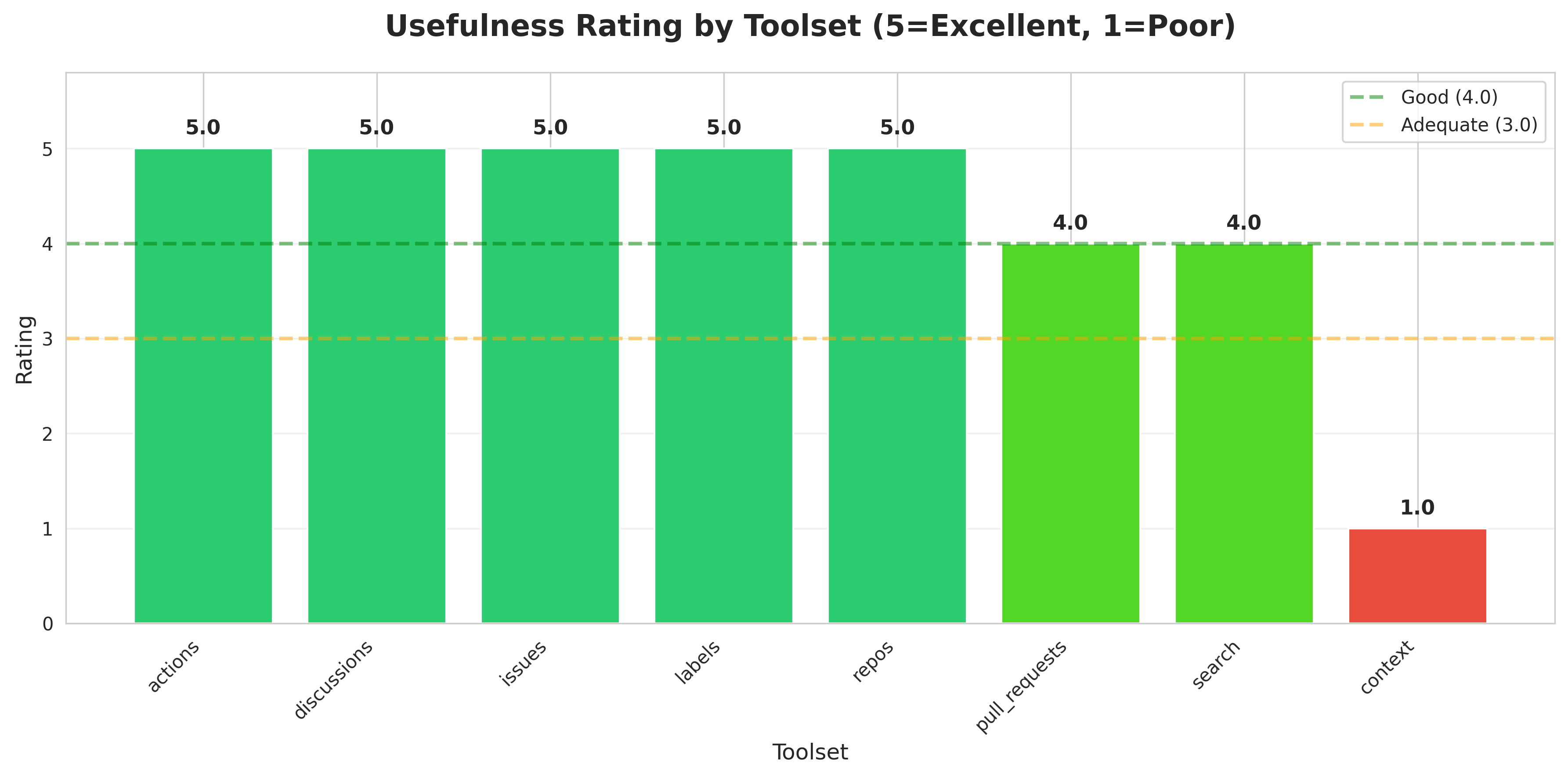 Most toolsets earn perfect 5.0 ratings for agentic work. Only pull_requests and search rate 4.0 due to verbosity. Context toolset rates 1.0 due to permission issues.