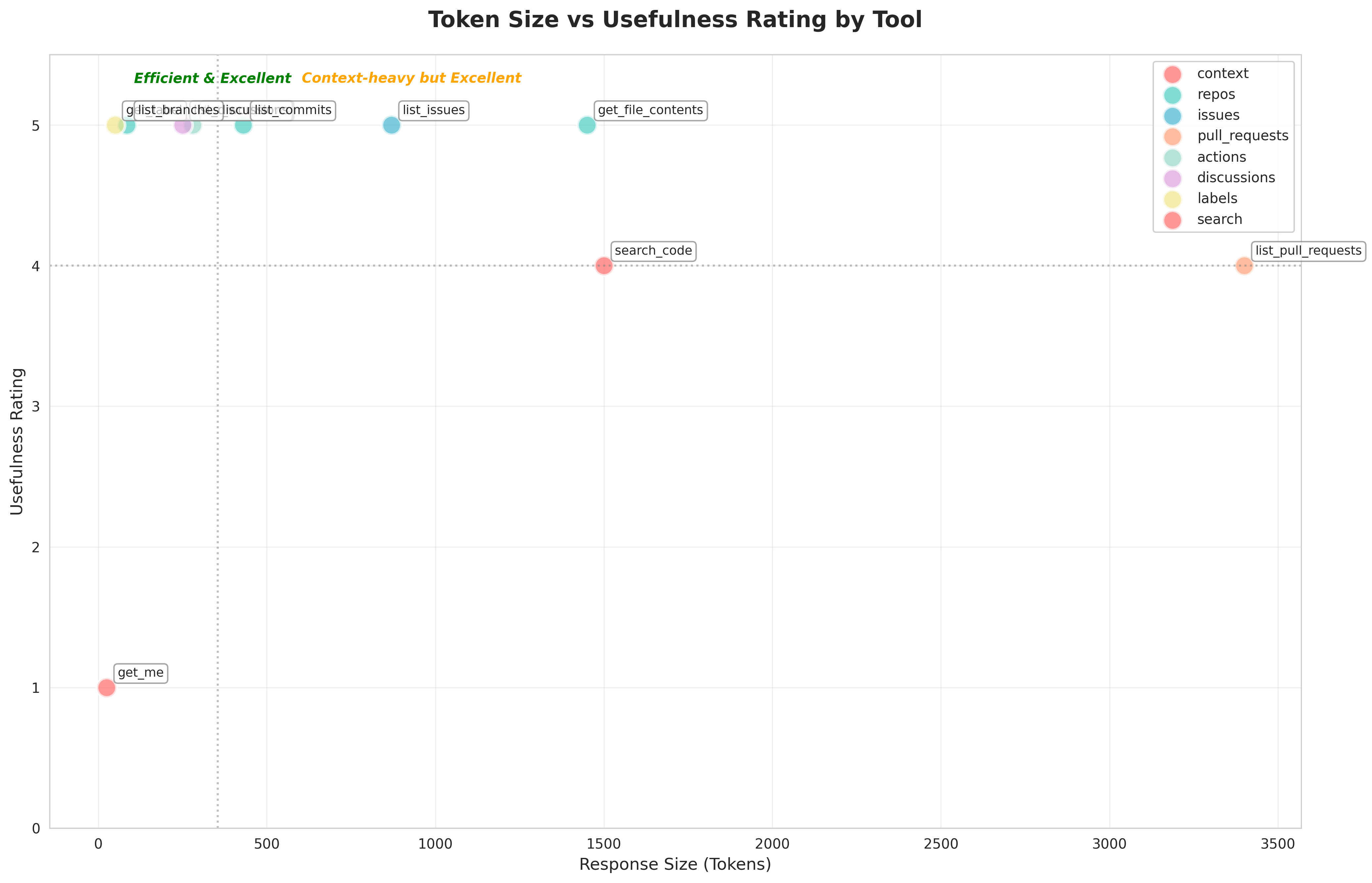 Scatter plot revealing the ideal zone: low token count + high usefulness. Tools like get_label, list_branches, and list_workflows achieve this balance. Pull requests are useful but context-expensive.