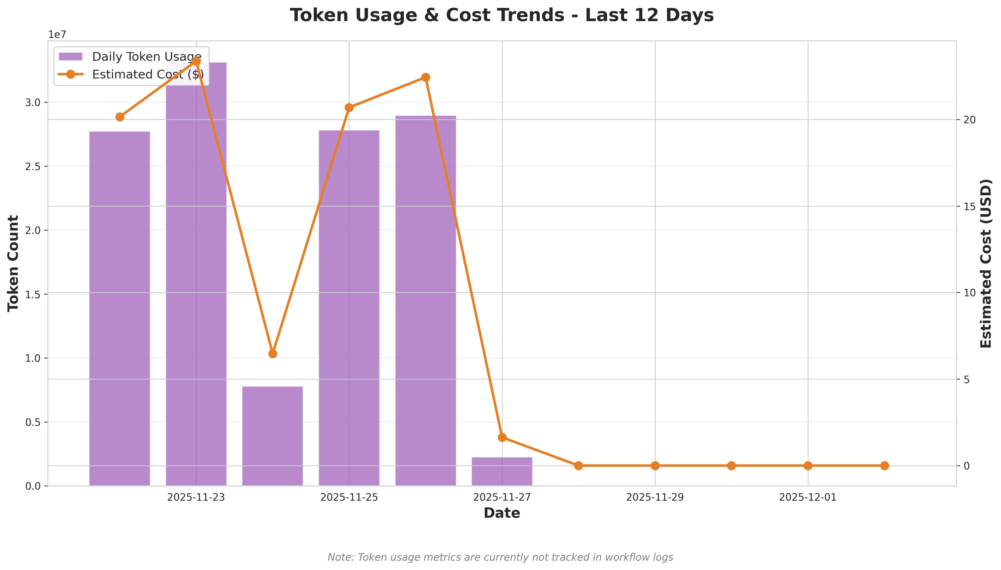 Token usage metrics are currently not being tracked in the workflow logs (all values are 0). This represents a significant observability gap. To enable cost monitoring and optimization, consider implementing token tracking in the workflow execution framework.