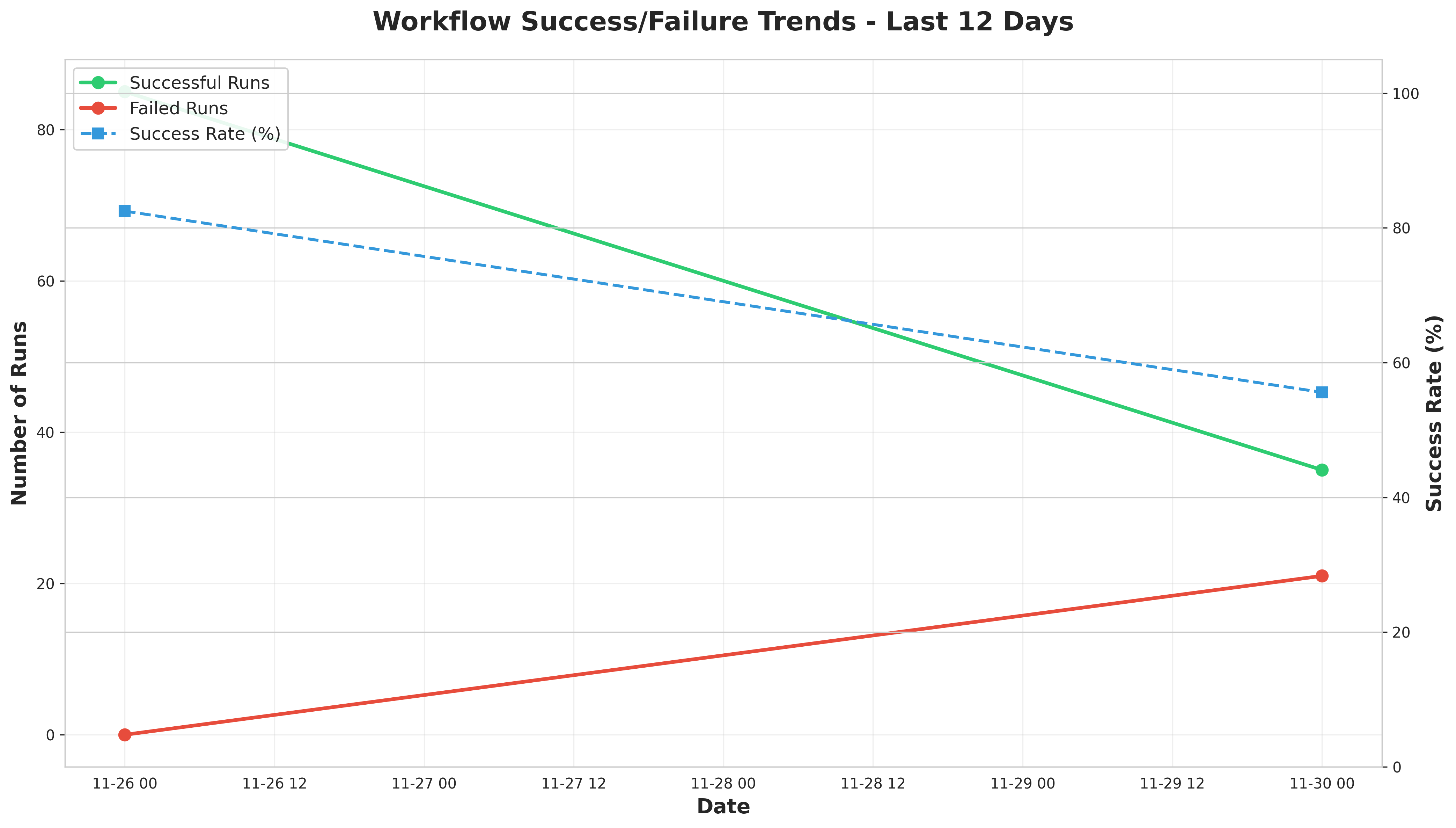 The 12-day trend chart reveals a concerning decline in workflow success rates. After reaching a peak of 97.1% success on November 24, the success rate dropped significantly to 55.6% by November 30. The past two days show a slight recovery to 63-66%, but this remains well below the earlier benchmark of 80-90% success rates. This downward trend suggests potential systemic issues that emerged in late November and persist through early December.