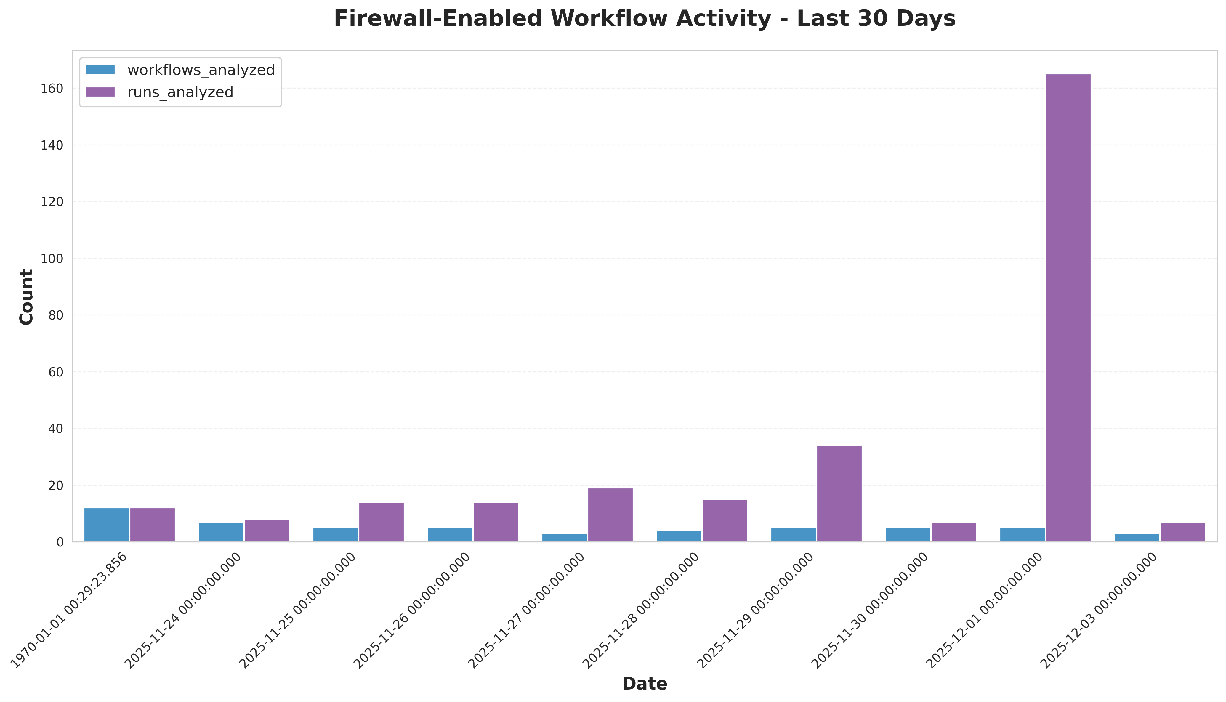 The workflow activity chart demonstrates stable usage of firewall-enabled workflows (3-5 unique workflows daily), with run counts varying based on scheduled triggers and manual invocations. The December 1st spike reflects intensive workflow execution during that period.
