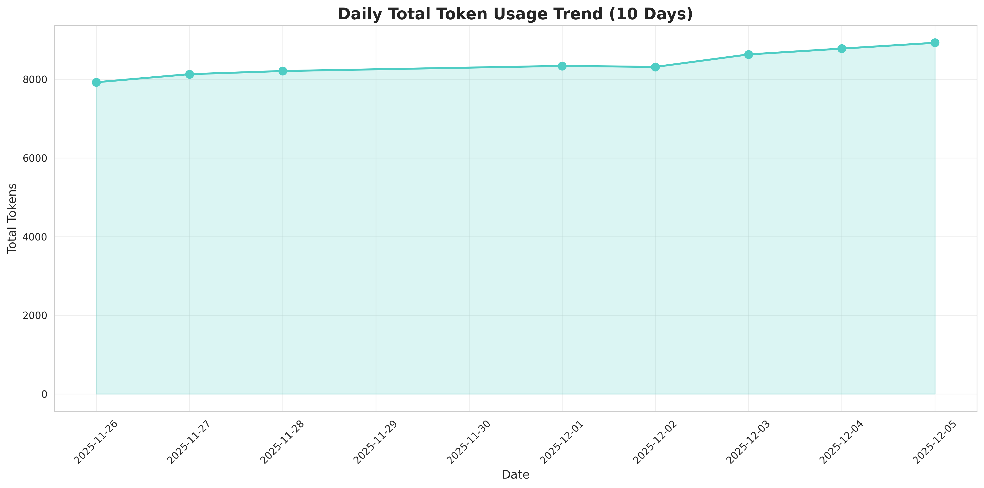 Analysis: Steady upward trend from 8,328 to 8,928 tokens (+7.2%) over 10 days. Growth correlates with repository activity (new issues, PRs, commits). Predictable, linear growth pattern.