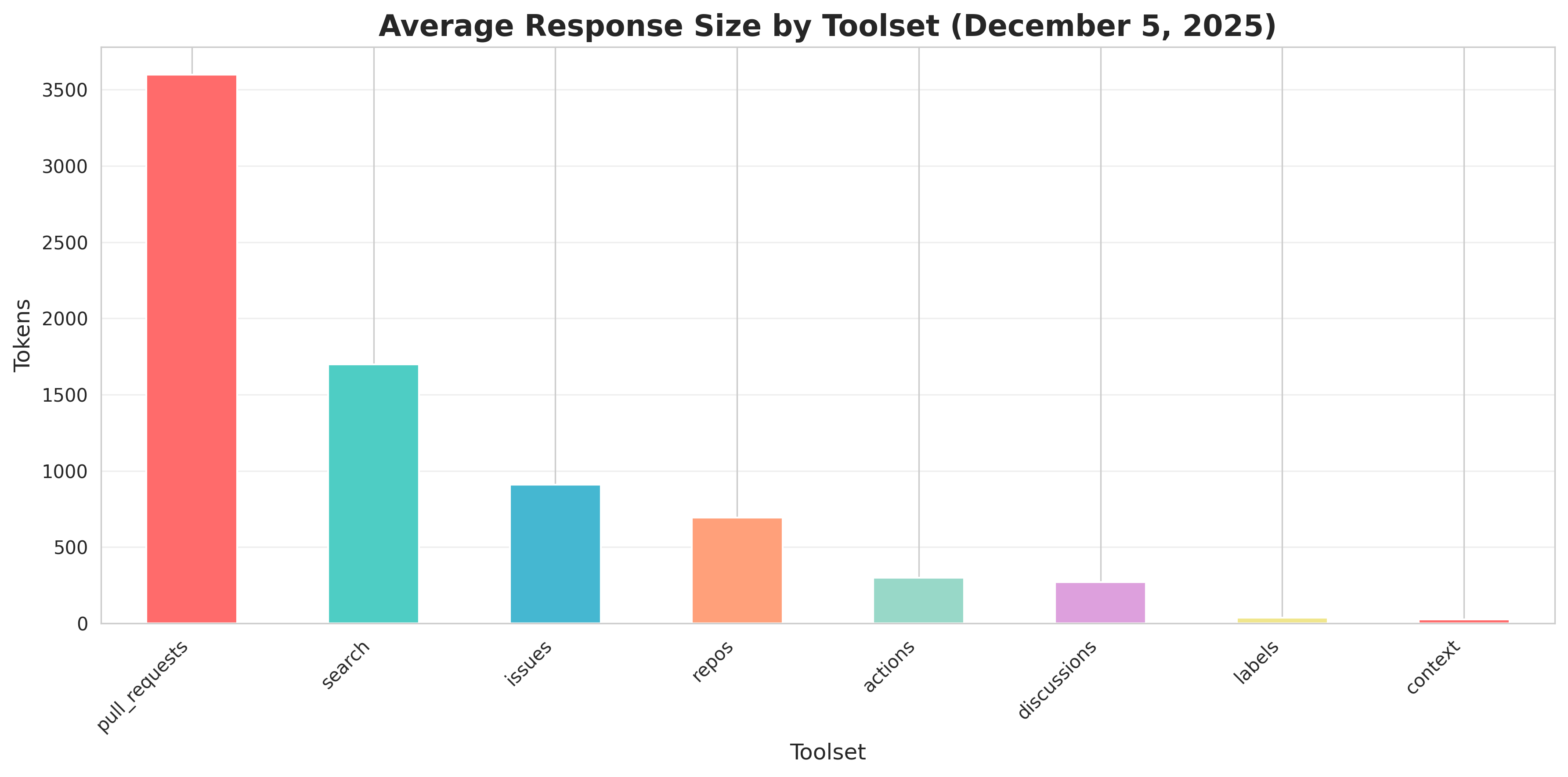 Analysis: Pull requests and search dominate token usage. Repos toolset shows high variance (65-1,550 tokens) depending on operation. Labels and discussions demonstrate excellent efficiency.