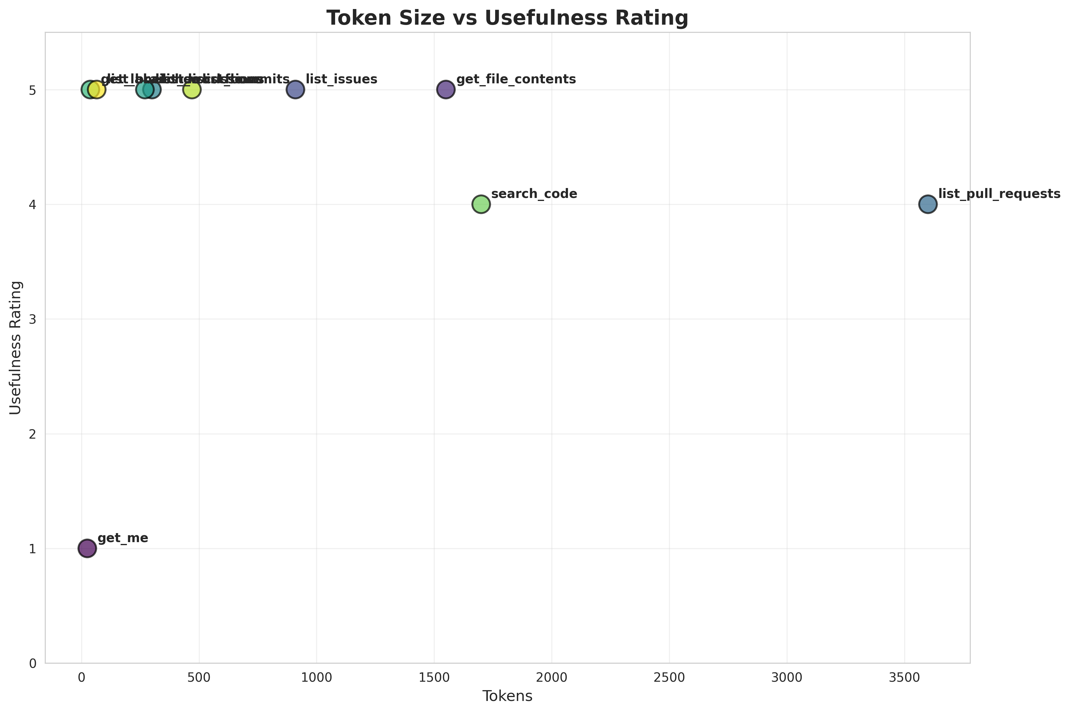 Analysis: No correlation between size and usefulness. Small tools (get_label, list_branches) and large tools (get_file_contents, list_issues) both achieve 5/5 ratings. Size reflects completeness, not quality. The 4/5 tools (list_pull_requests, search_code) are marked for potential optimization.