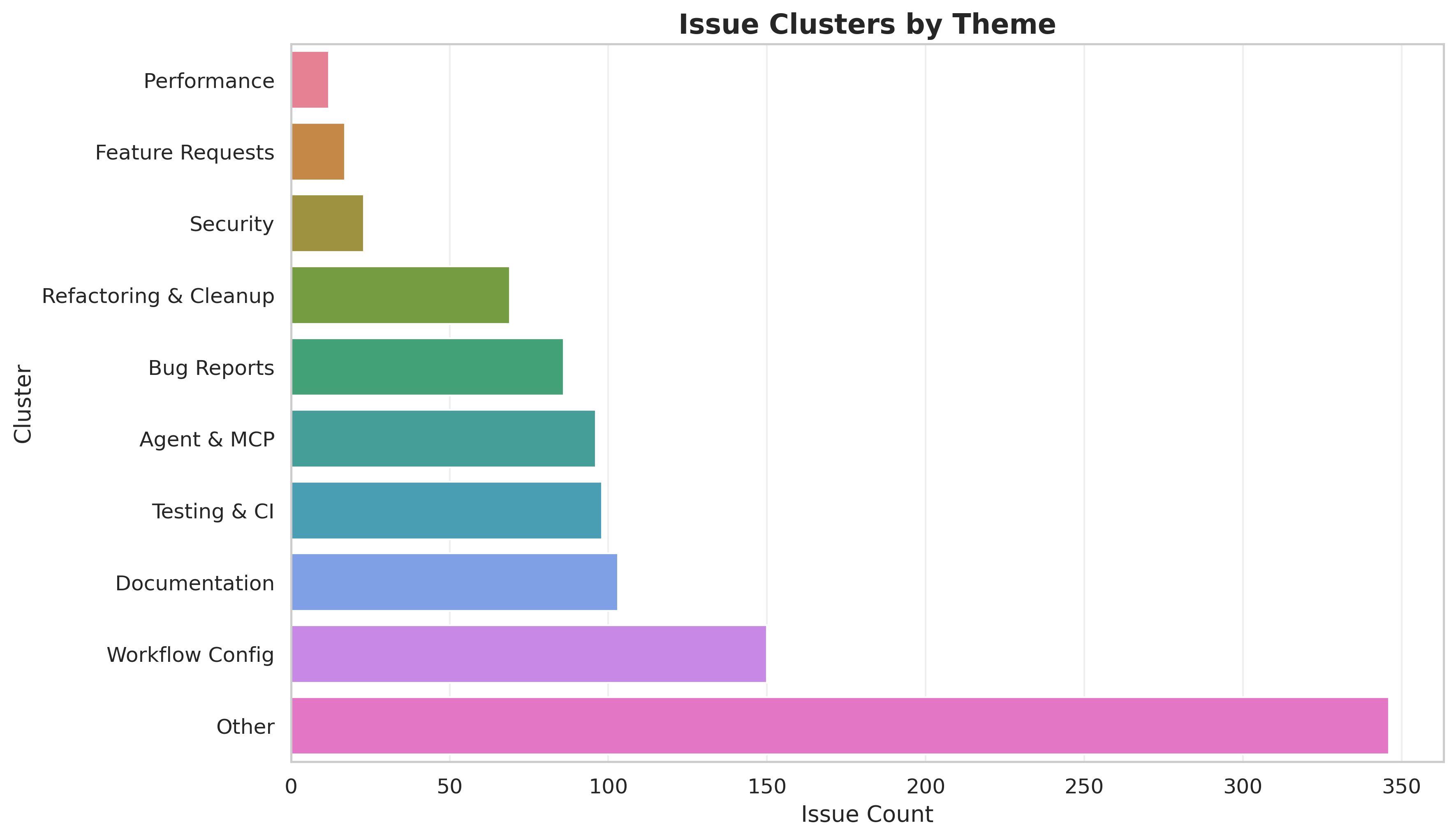 Workflow Config (150), Documentation (103), Testing & CI (98), and Agent & MCP (96) dominate, reflecting heavy automation and platform tuning. Bug Reports (86) are modest; Performance (12) and Security (23) remain small but should still be triaged promptly.