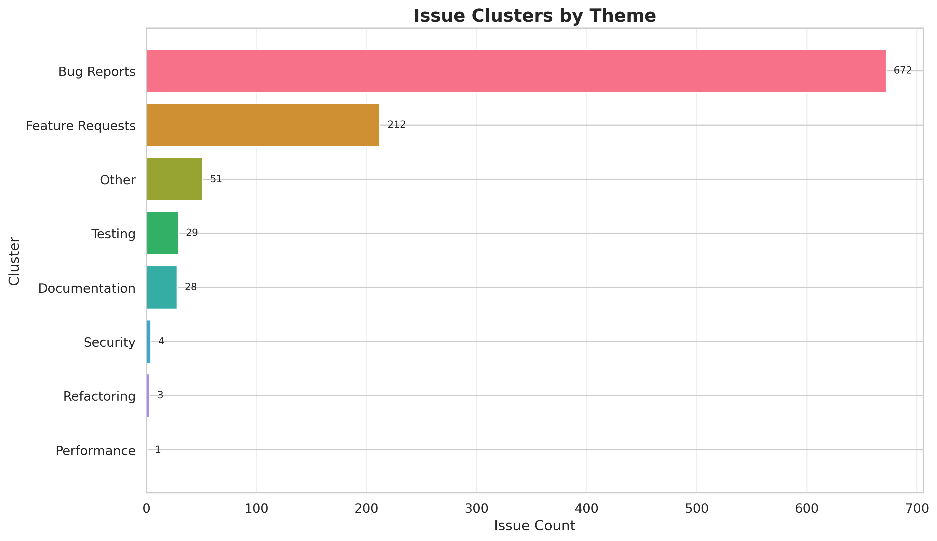 Bug Reports dominate current work (672), followed by Feature Requests (212). Documentation and Testing clusters are small but present; Security and Performance surface only a handful of items.