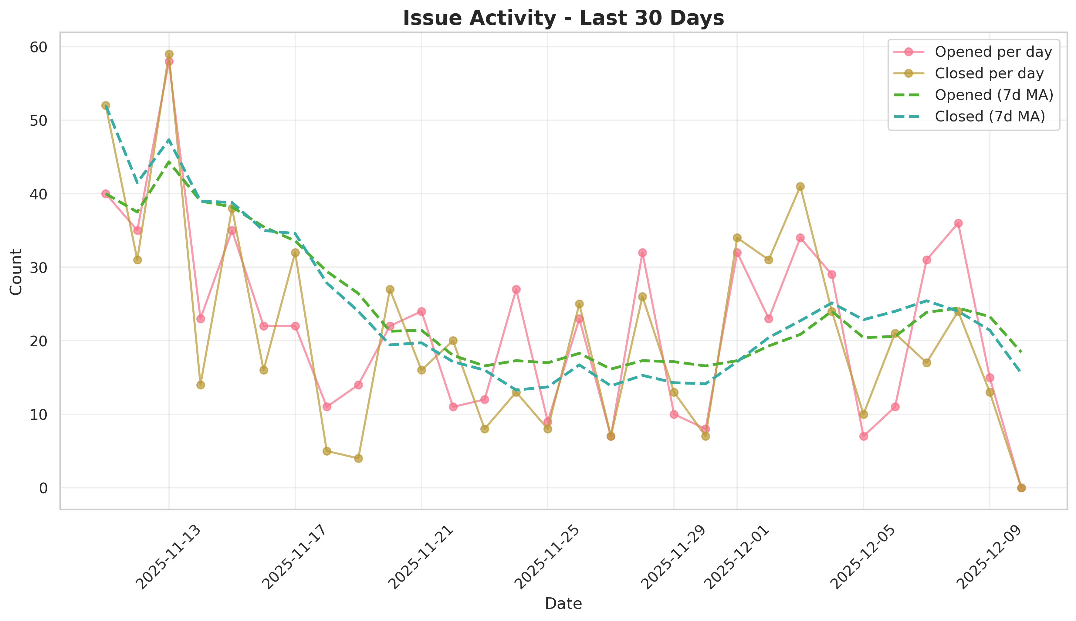 Open volume (667 issues in 30 days; 158 in 7 days) stayed elevated while closures largely kept pace, keeping the open count low. The 7-day moving averages for opened vs. closed remain tight, indicating prompt follow-through despite sustained intake.