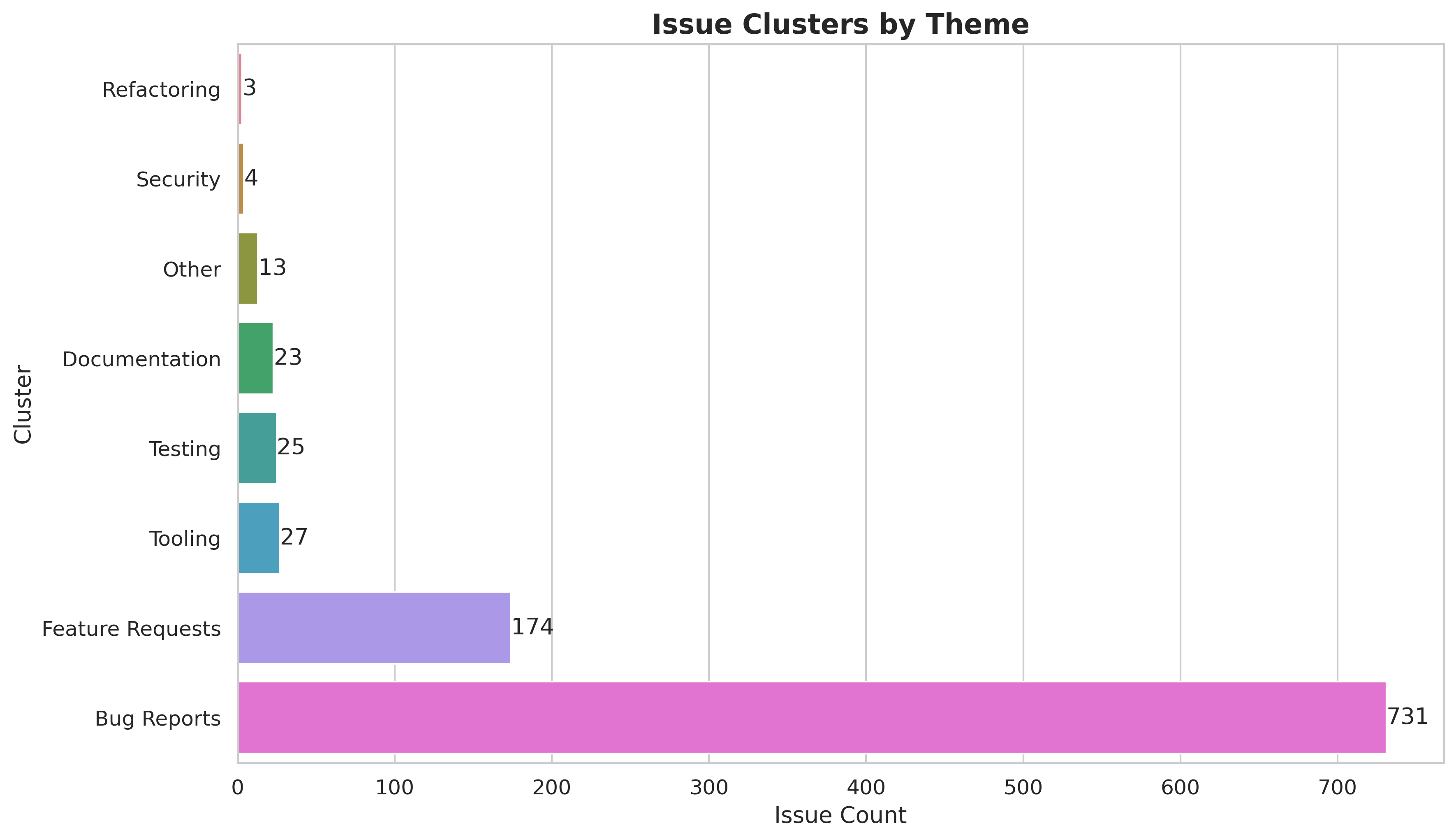 Bug Reports dominate (731) with Feature Requests next (174); Tooling/Testing/Documentation are small but steady, and only one Security cluster item surfaced. Focus remains on bug/feature flow, with minimal long-tail clusters.