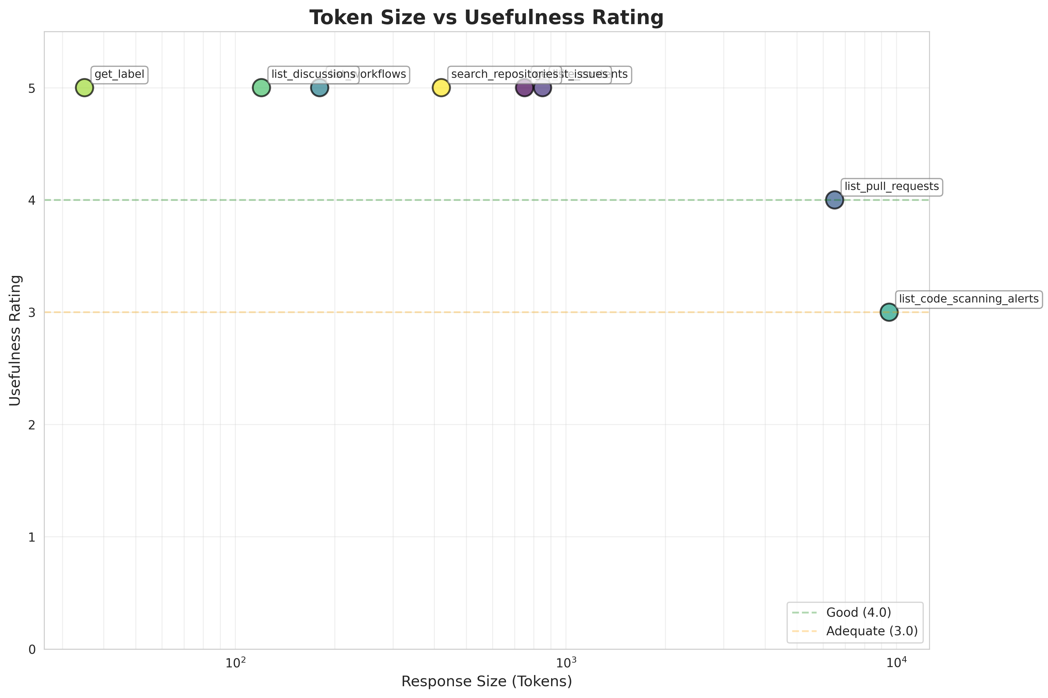 The scatter plot reveals an efficiency sweet spot: tools with 100-1000 tokens achieve the highest usefulness ratings. Tools beyond 5000 tokens show diminishing returns.
