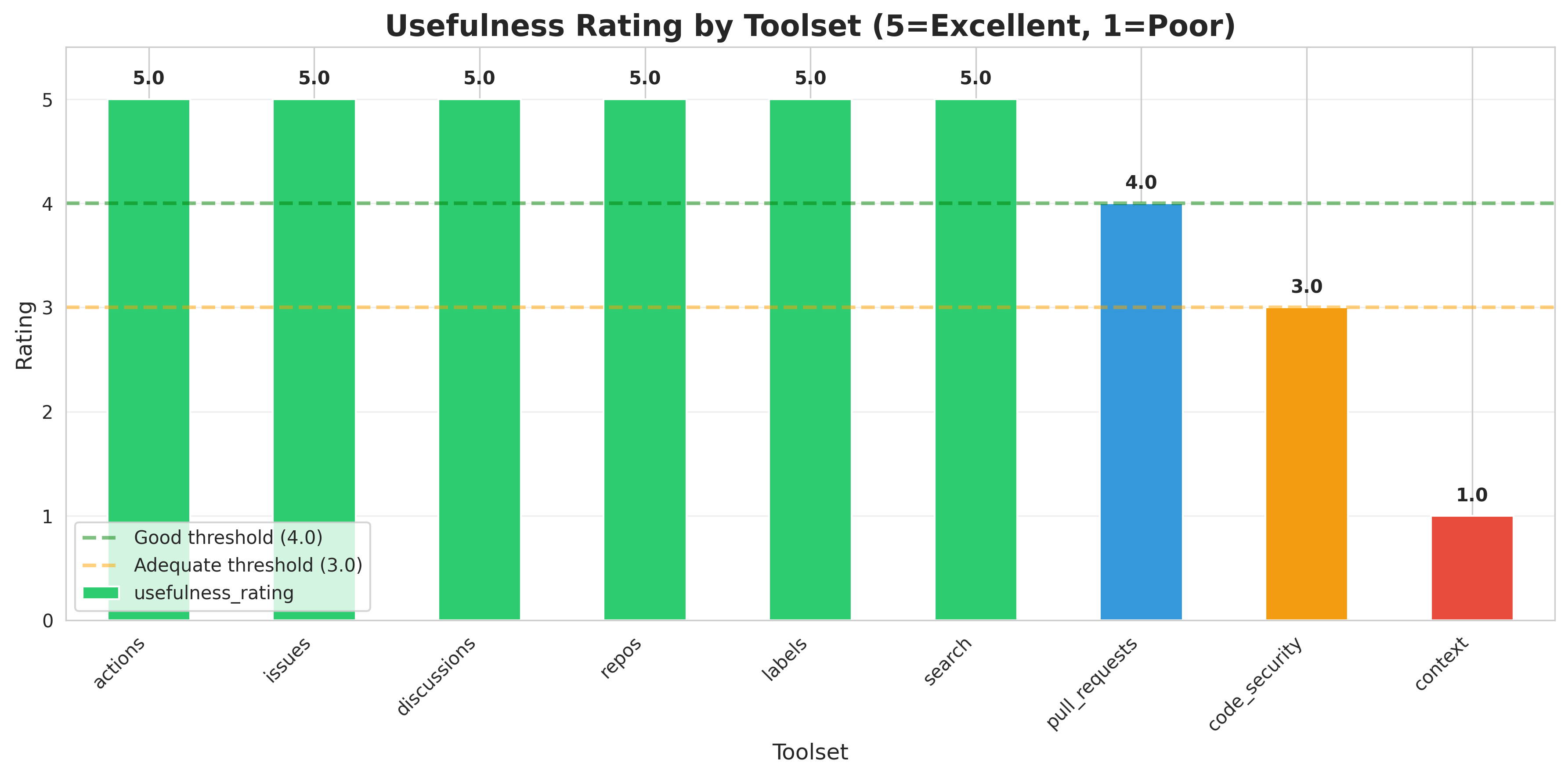Most toolsets achieve good-to-excellent ratings (4-5/5), with only code_security dropping to adequate (3/5) due to bloat.