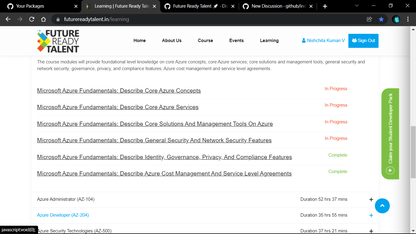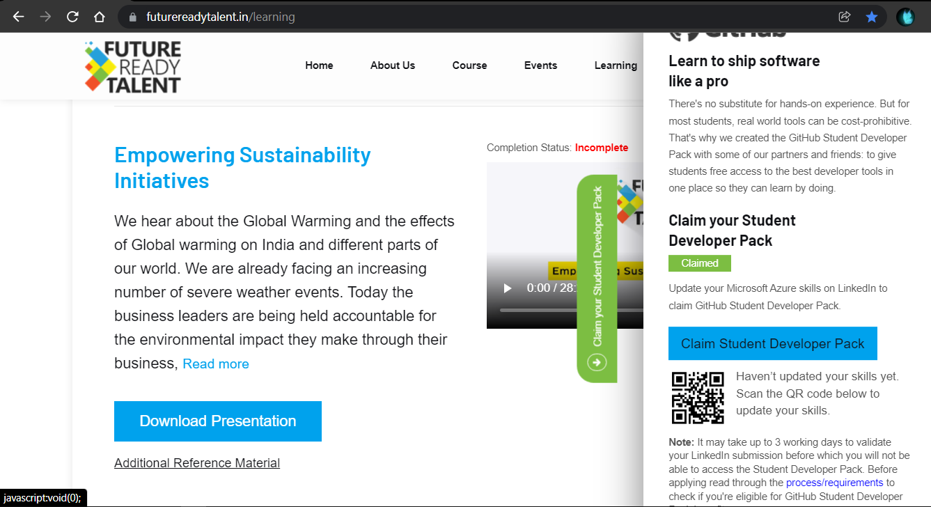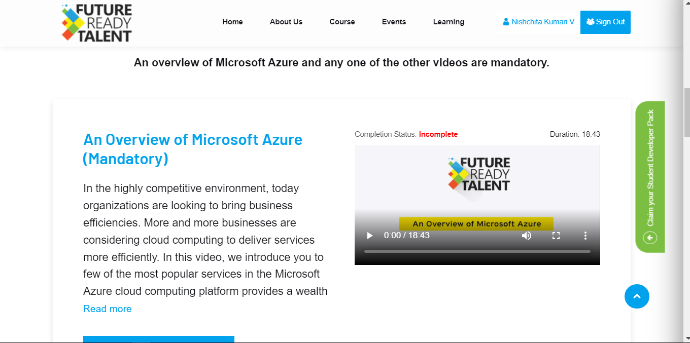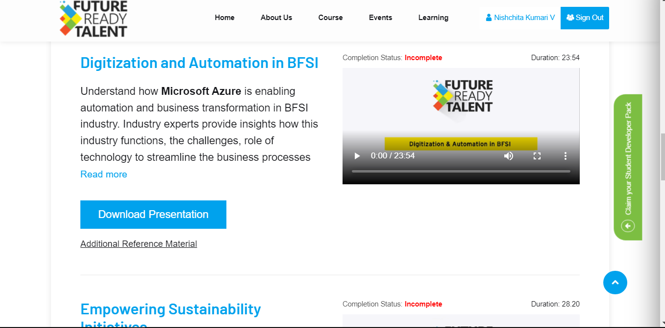 Hello team, Industry Sessions showing incomplete but i did watched them more than 6 to 7 times... And also i haven't got mail from FRT about my SDP, its showing claimed from so many days but haven't got mail and i don't know how to claim it and how to get azure subscription. |