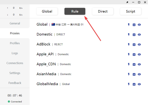 (6)点击新增的配置文件来切换到该配置,然后点击「Proxies」标签页来切换接入点,将顶部的出站模式选择为「Rule」。