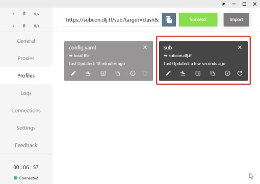 (5)Clash for Windows 会自动拉取配置文件进行更新,如果一切顺利,你应当可以看到绿色提示信息「Success!」,并且可以看到一个新增的配置文件: