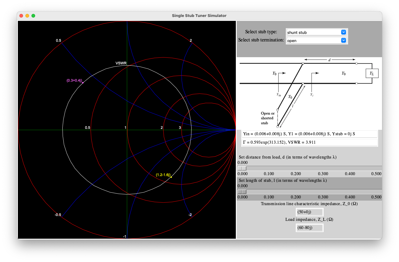 Single Stub Tuner Simulator A simulator for single stub matching network under lossless transmission line condition made using Python Tkinter and Turtle allows selection between series or shunt stub and open or short stub Series stub example: demo2.mov Shunt stub example: demo.mov