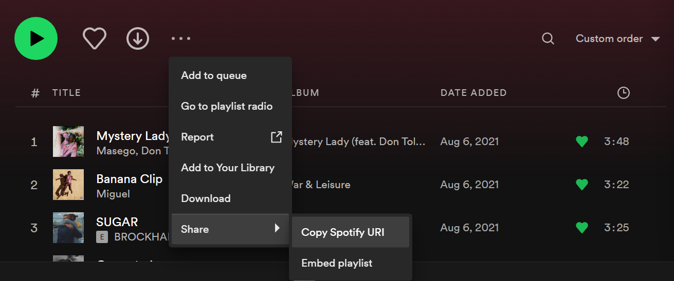 In Spotify Desktop, search for the playlist you would like to reorder and click the three dots under the playlist name. Click the Ctrl button your keyboard and click share. You can then copy the Spotify URI of the playlist
