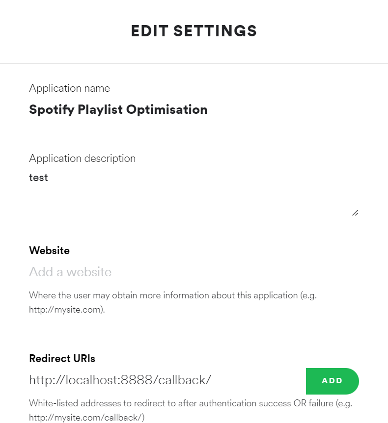 Here you can create a project and retrieve the client ID and client secret. You also need to set up a redirect URI to access the API. Click Edit Settings and set the redirect URI to http://localhost:8888/callback/. When calling the API in Python you will be redirected to sign into your Spotify Developer account.