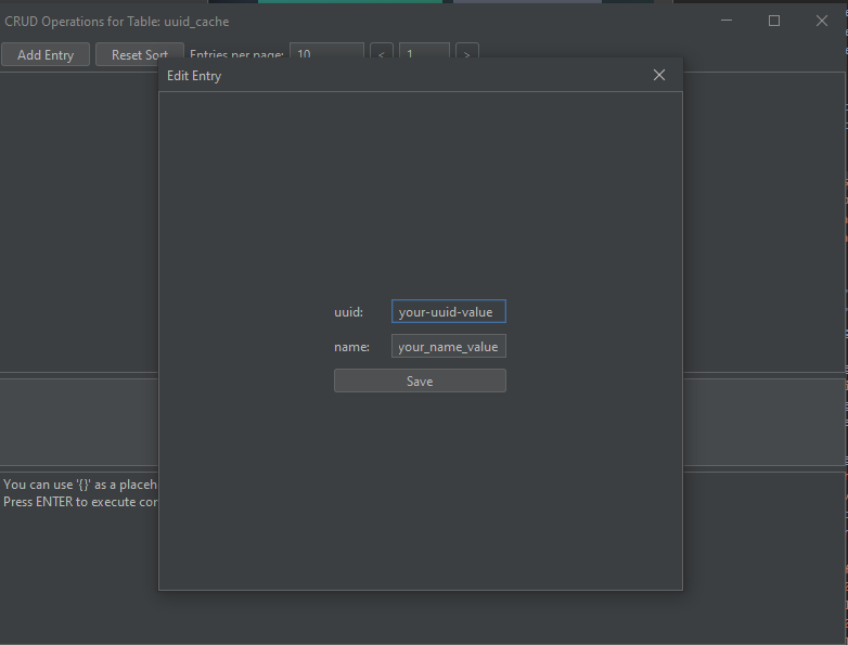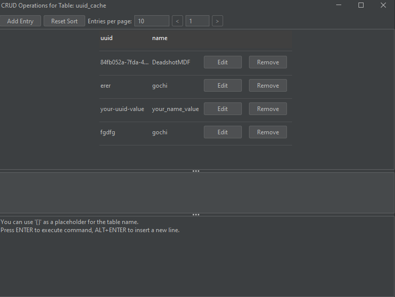 {}can be used as a placeholder for the current table name. For example,SELECT * FROM {}. - To insert a line break in the console, press