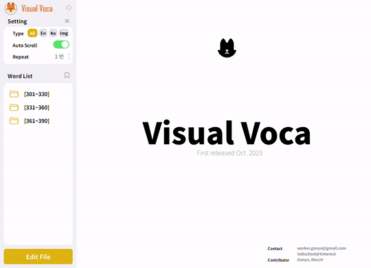 Visual Voca는 깜빡이 형태로 단어 암기를 돕는 프로그램입니다. 이 프로그램은 반드시 웹(Web) 사용이 가능한 온라인 환경에서 실시되어야 합니다.