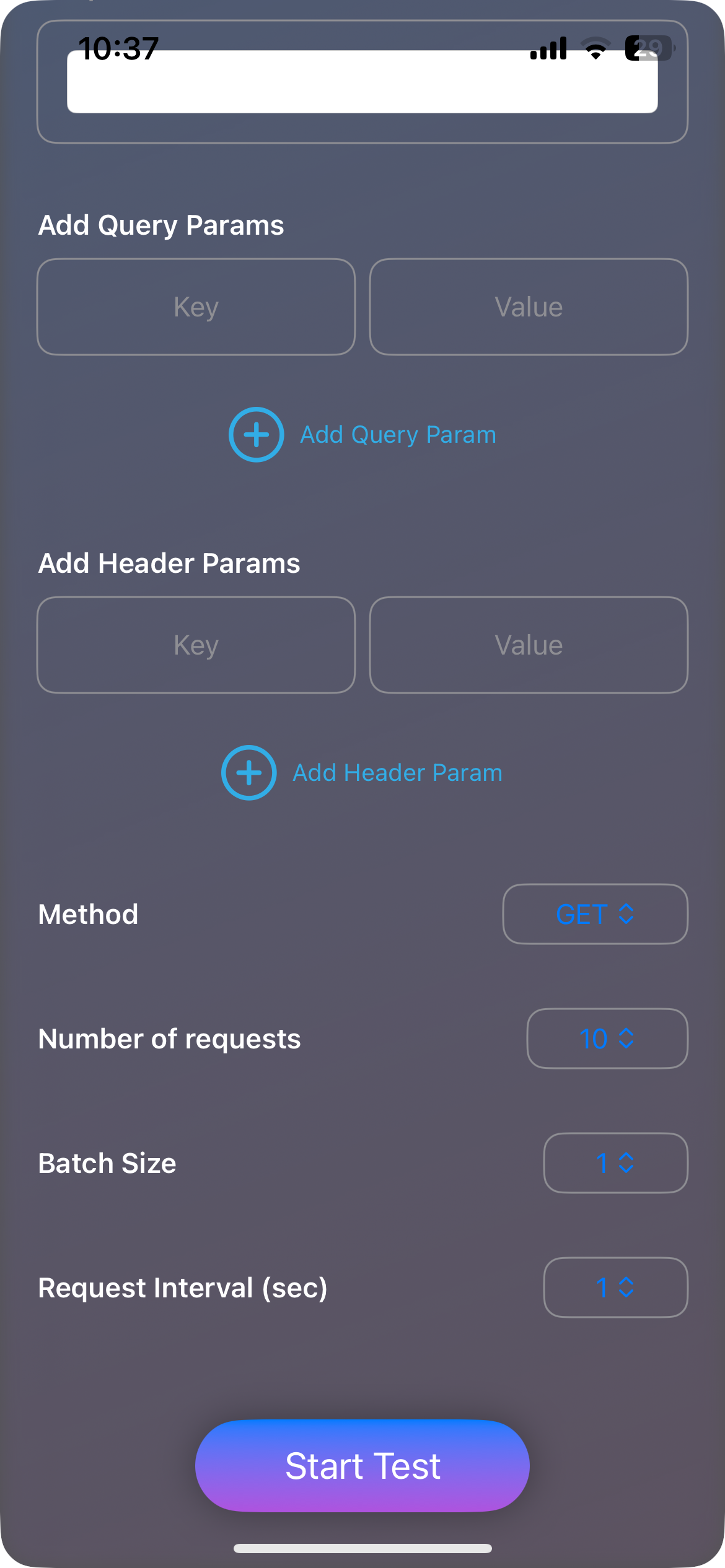 | Test Configuration | URL, method, query params, headers, number of requests, batch size, interval settings |